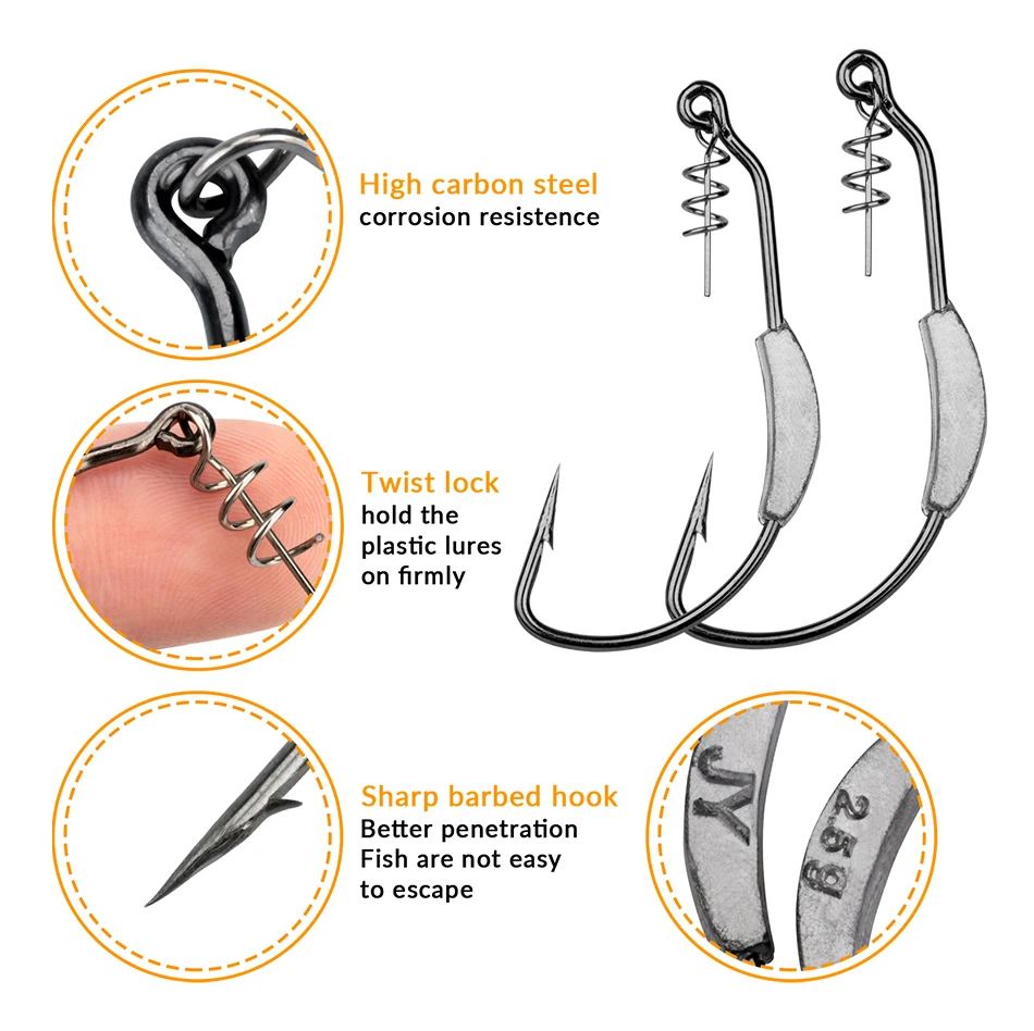1. The weighted swimbait Hooks with twistlock centering-pin spring are designed for weedless application. Better rig fat headed lures,such as soft plastics and swimbaits,it swims naturally,won't get stuck in weeds,grass or rocks on the bottom.
