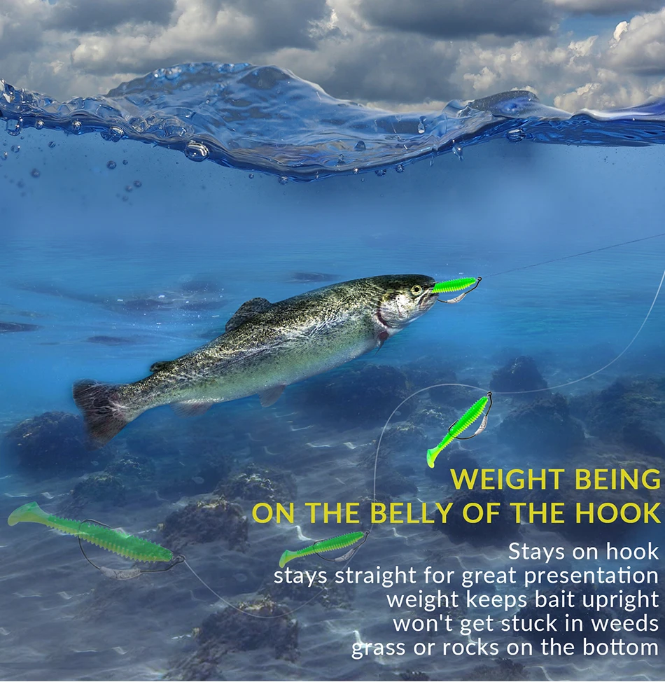 2. With the weight being on the belly of the hook,keeper holds baits very tight on hook.Weight to helping your bait get down into the strike zone quickly.spiral lock with center pin provides a easier and more convenient way to rig swimbait, also help expand your lure's life.
