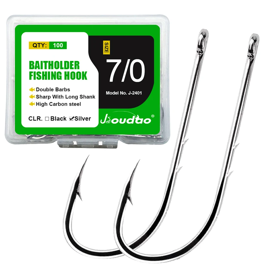 Anzuelos de pesca Baitholder, 100 Uds., anzuelos de pesca de vástago largo, anzuelos de cebo de pico farpado con 2 púas, anzuelos de pesca de plantilla de acero al carbono plateado, agua dulce salada