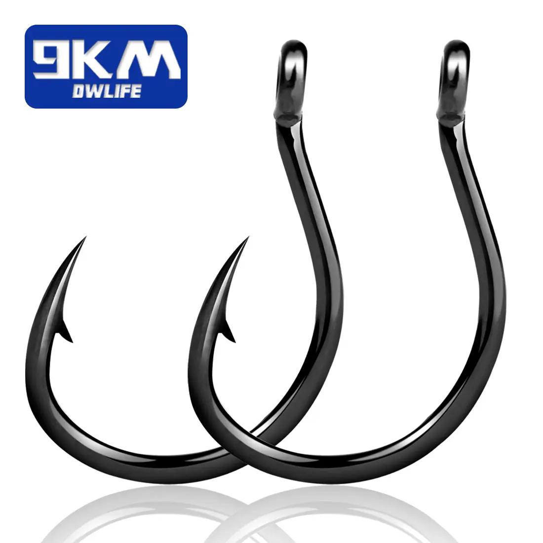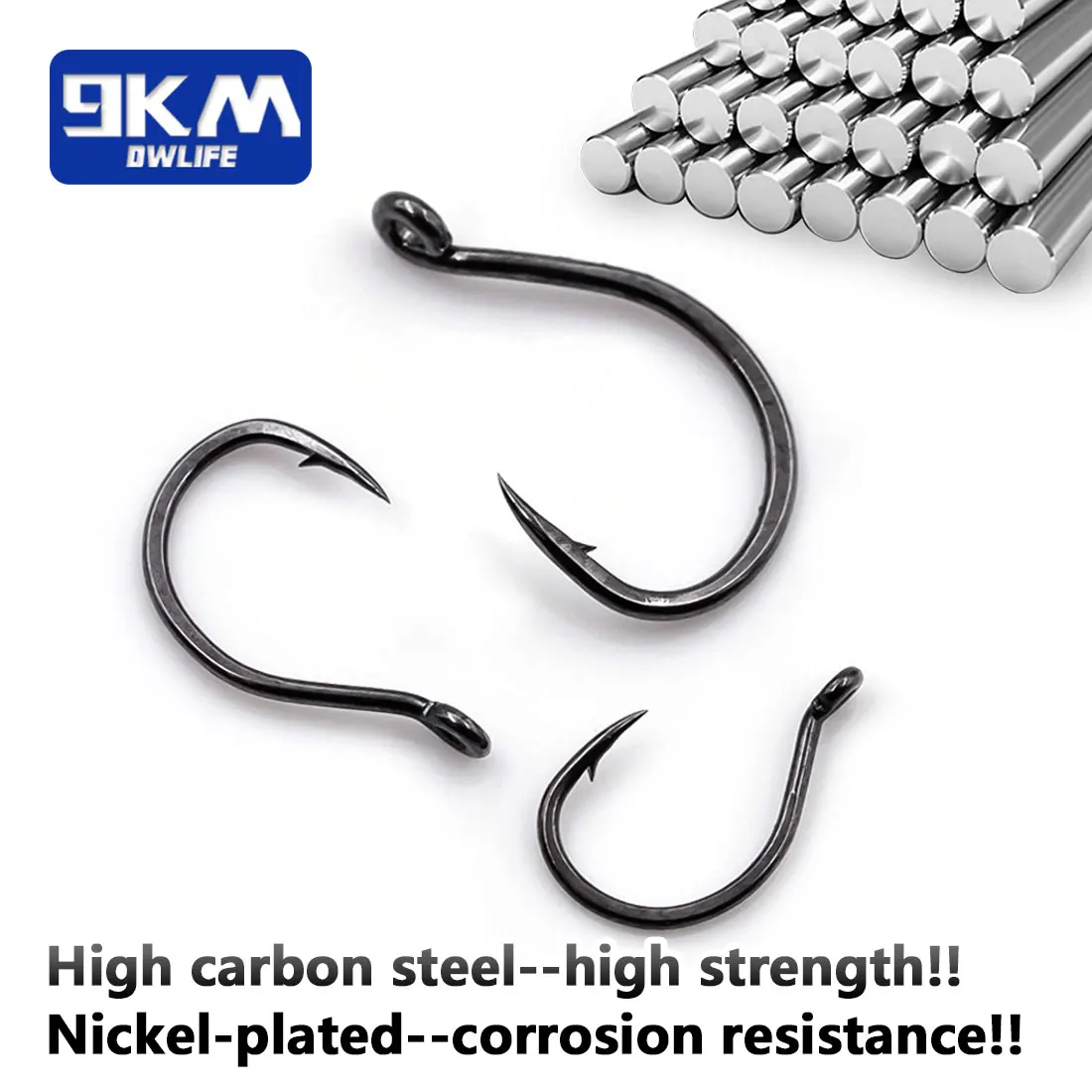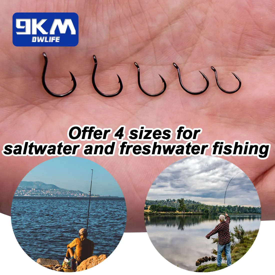 Anzuelos de púas: Todos los anzuelos son anzuelos de pesca con púas y se pueden usar para atrapar peces grandes. Esto hace que el pez sea más fácil de desenganchar sin dañarlo. La punta afilada del anzuelo y La Púa son más fáciles de perforar la boca del pez. Los anzuelos tienen una forma curva especial que reduce el riesgo de que el pez se caiga.