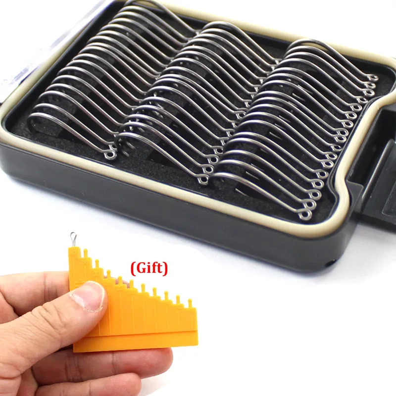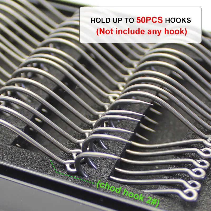 1.Puede contener hasta 50 ganchos de CARP individuales en tamaños de 2 a 8 --- como un gancho de vástago curvo, un gancho de puntero y un gancho de espacio ancho. El inserto de EVA ranurado está diseñado para sujetar cada gancho individual de forma segura en su lugar.