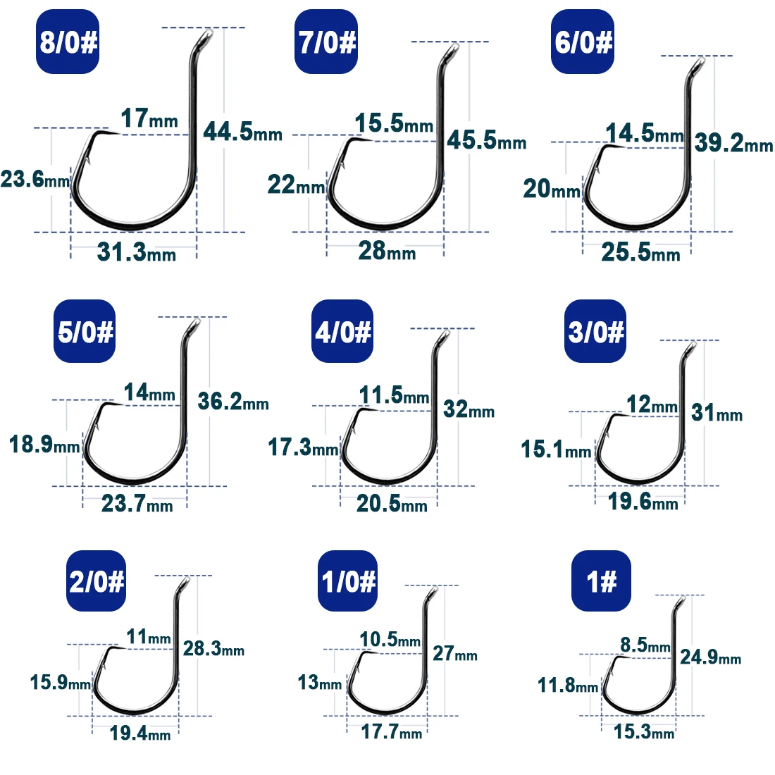 Múltiples tamaños: 9 tamaños diferentes (1 # a 8/0 # ) para adaptarse a sus múltiples aplicaciones de pesca que garantizan el placer de continuar pescando. Servicio posventa: si tiene alguna pregunta, comuníquese con nuestro servicio de atención al cliente, resolveremos su problema dentro de las 24 horas.