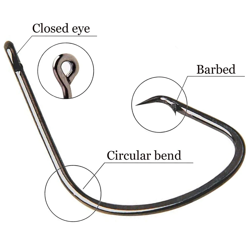 Diseño: Ganchos de púas de ojo cerrado en línea. Una curva redonda adicional y un punto de corte extremadamente afilado le ofrecen una mejor penetración en los gusanos señuelos y una mayor relación de enganche