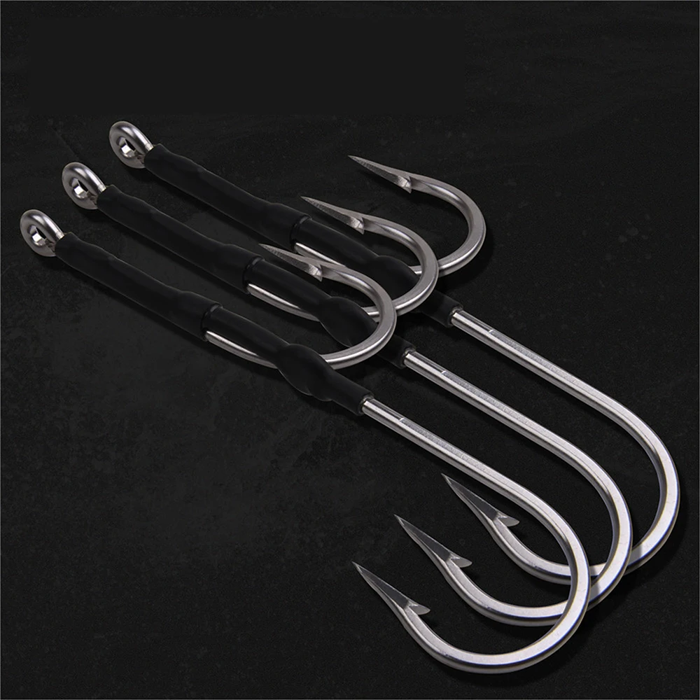 3. Ganchos de asistencia para jigging de alta resistencia, aparejo de doble gancho atado hacia arriba, ganchos de aparejo de cable de acero para trolling y chunking, ideal para Wahoo, atún, marlin y más.