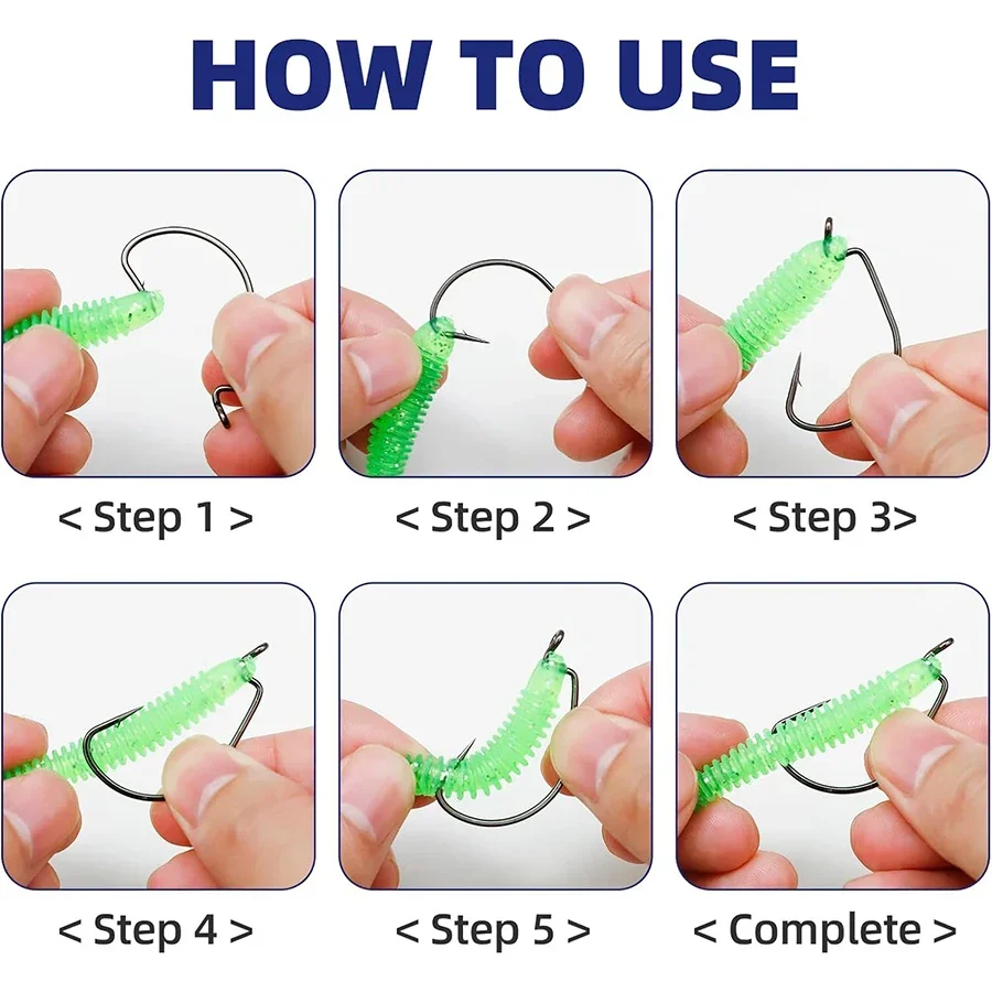► Diseño con huecos anchos --- Se pueden usar gusanos de diferentes tamaños y el anzuelo de pesca de lubina se puede incrustar fácilmente en una configuración natural. La curva ancha reduce la posibilidad de que los peces lancen el anzuelo del gusano.
