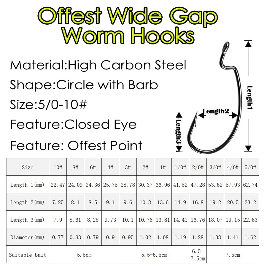 ►Amplia aplicación --- Este gancho de gusano compensado es adecuado para gusanos de diferentes tamaños. Es apto para varias aplicaciones de cebo de plástico blando, como Carolina Rig, Texas rigand Craws Beaver Baits. Los anzuelos también se pueden utilizar para la pesca de agua dulce y salada.