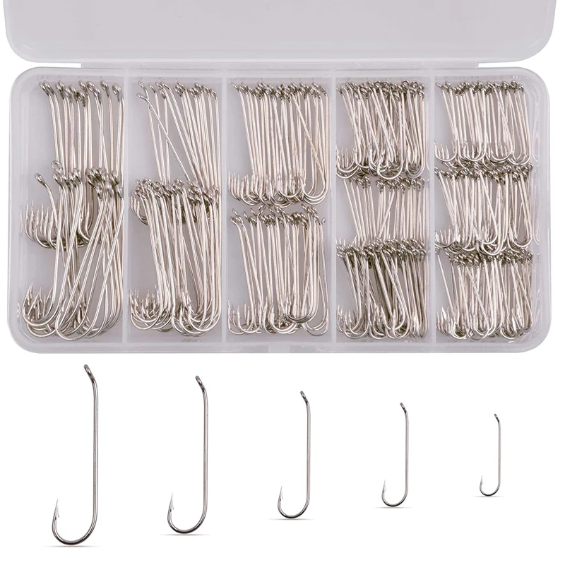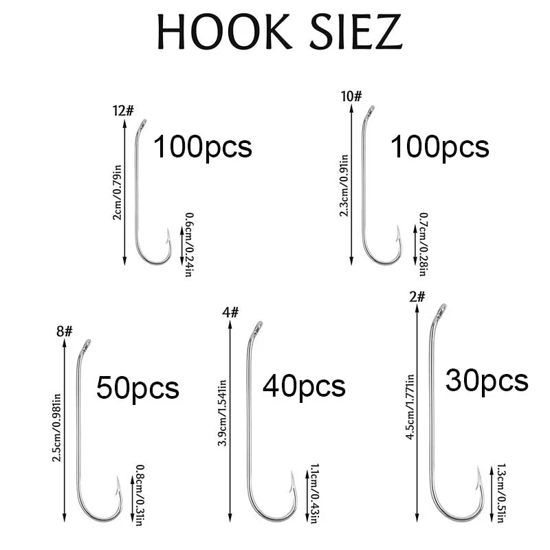 Cantidad: 320 Uds. Tamaño: #2, 4 # , 8 #, 10 #12 # Paquete: caja de plástico Color: plata Características: Anzuelos afilados de caña larga para atar moscas, fácil de atrapar Diferentes tamaños mezclados, más opciones Paquete de caja de plástico, fácil de llevar Nota: puede haber algunos errores de medición, no se preocupe. Gracias