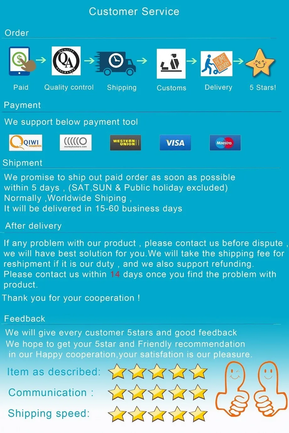 Agradecemos sus comentarios positivos de cinco estrellas si está satisfecho con nuestros productos, no dude en contactarnos si no está satisfecho. ¡Gracias!