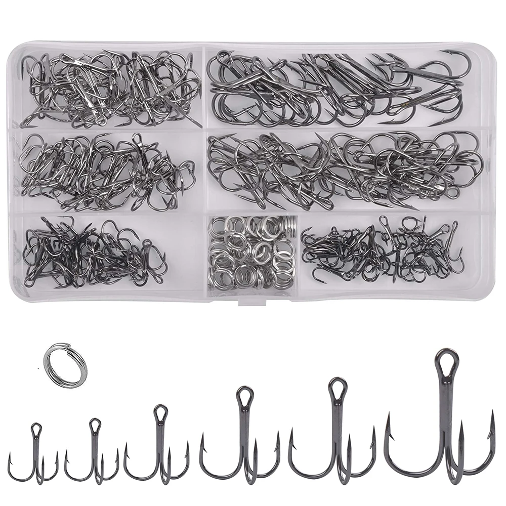 180 unids/caja de anzuelos de pesca triples, anzuelo triple de curva redonda afilada, anzuelos de púas con juego de anillos divididos para aparejos de pesca de lubina