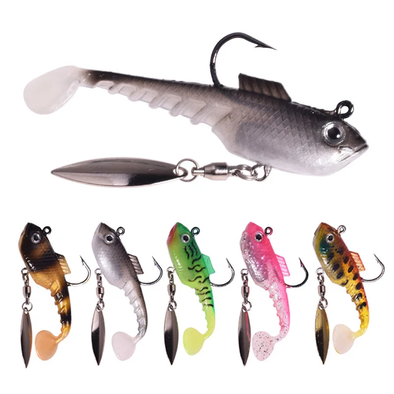 1 Uds. Anzuelos de plantilla cebo suave de silicona con cuchara giratoria lentejuelas cola en T Wobblers señuelo de pesca Artificial para Lucio Bass Swimbait
