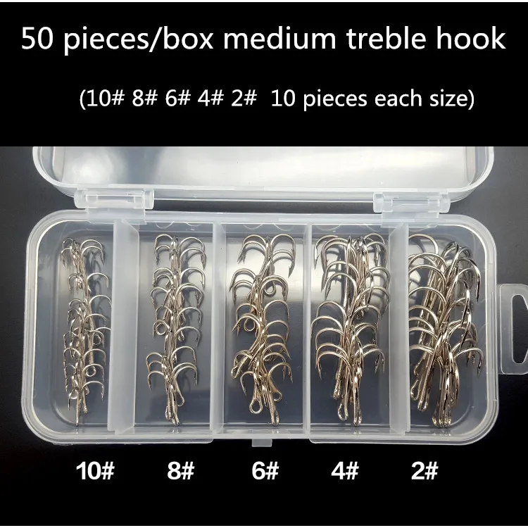 Anzuelos triples afilados en caja, anzuelos de pesca con púas de acero de alto carbono, tamaños 2/4/6/8/10 #, Plata/Negro, 50 unidades por lote