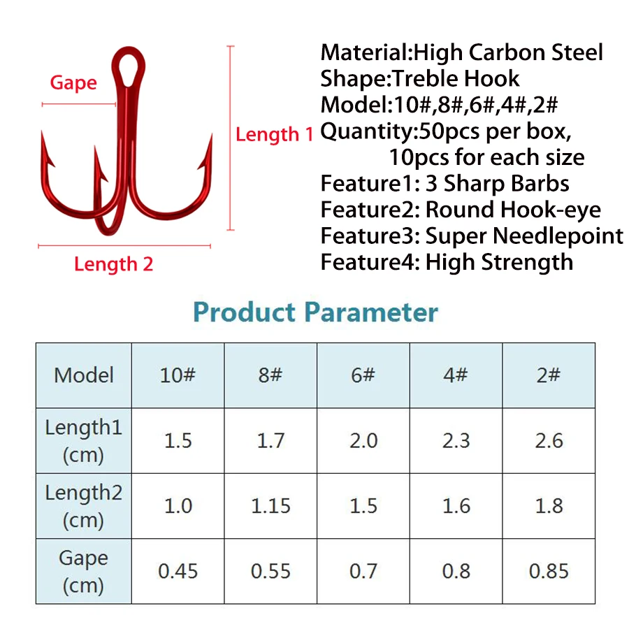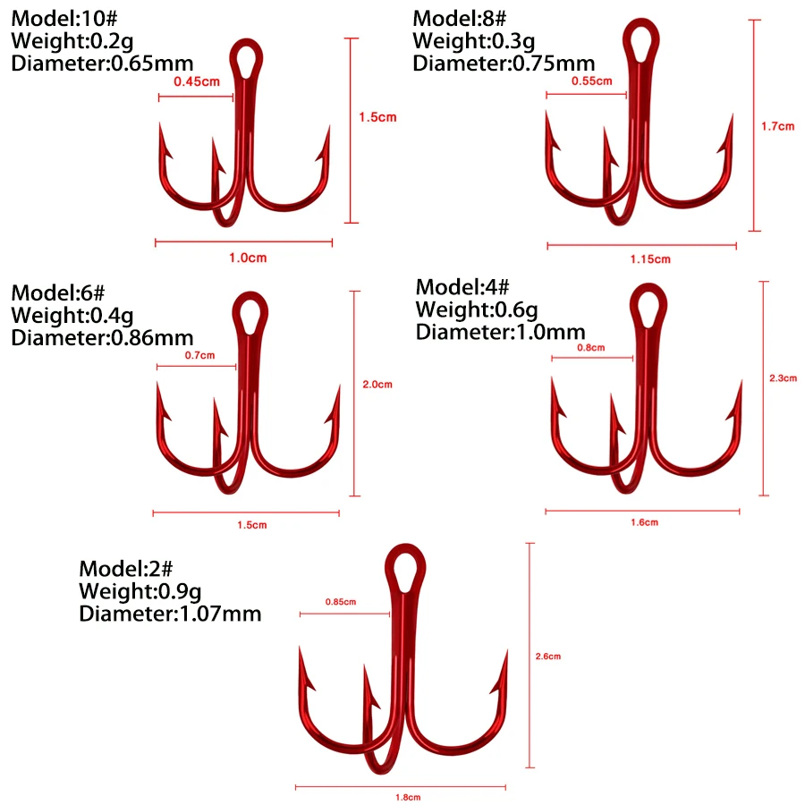 1.Gran juego de anzuelos triples rojos, surtido de 5 tamaños:2# 4# 6# 8# 10#, 10 piezas de cada tamaño, 50 piezas en caja transparente para aparejos de pesca.