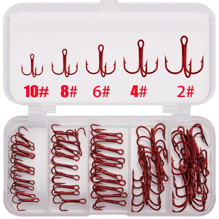 1.Gran juego de anzuelos triples rojos, surtido de 5 tamaños:2# 4# 6# 8# 10#, 10 piezas de cada tamaño, 50 piezas en caja transparente para aparejos de pesca.