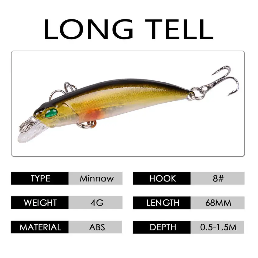 Especificaciones:Tipo de señuelo: Mini señuelo de pesca MinnowTamaño: 6,8 cm 4 gOjos: ojos de pez 3DAnillos: Anillos planosColores: como imagenPeces objetivo: chub pálido, bagre ambulante, carpa de cheque amarillo, tilapia, bagre, culter de Topmouth