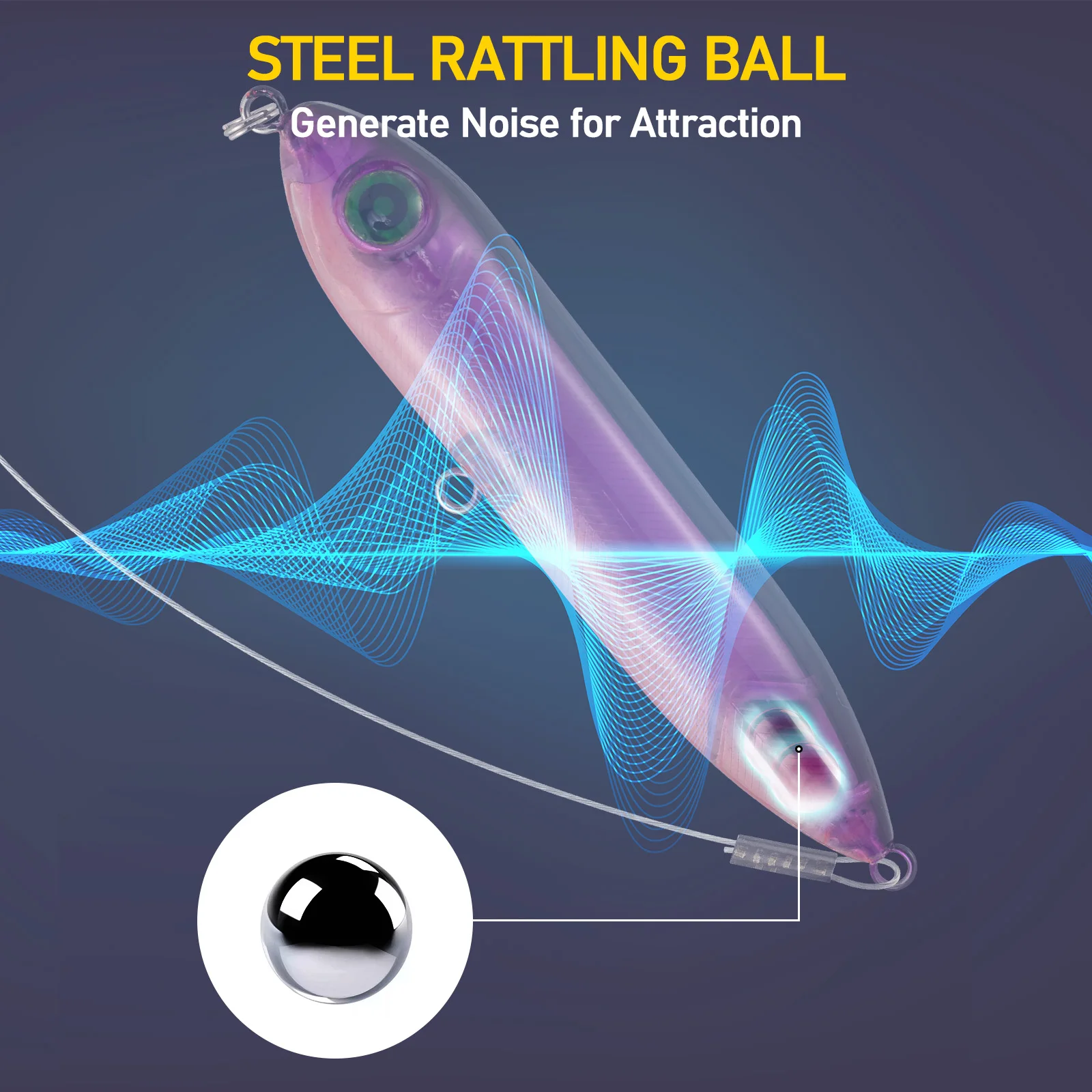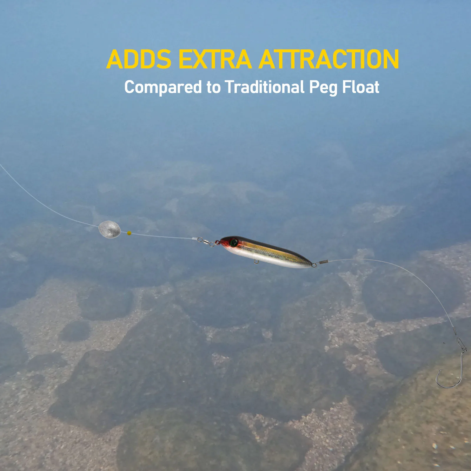 El flotador tiene un revestimiento exquisito y un cuerpo de plástico ABS con bolas de acero en su interior.Las bolas de acero generarán ruidos fuertes bajo el agua, mejorando el atractivo del cebo.