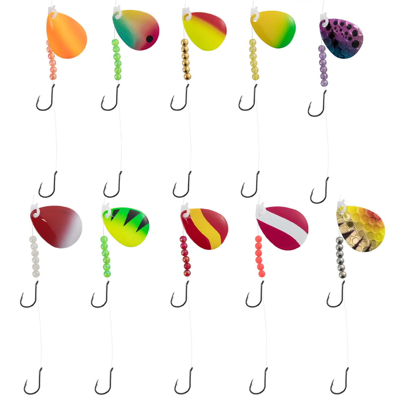 Este Kit de aparejos de lucioperca incluye 10 aparejos únicos de lucioperca en 10 colores diferentes. Cada aparejo incluirá una hoja de Colorado #3, 2 anzuelos de pulpo #2 de #2, una horquilla, un mono de 15 libras y seis cuentas de pesca.