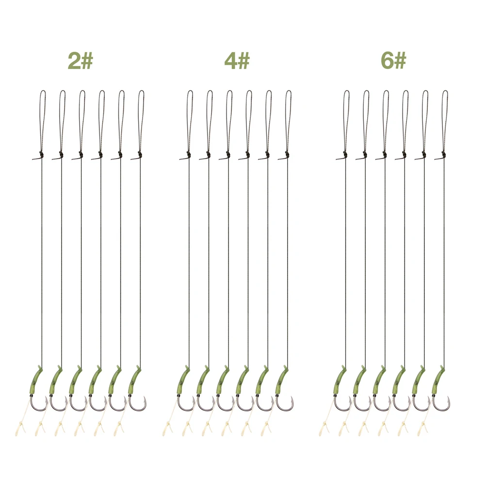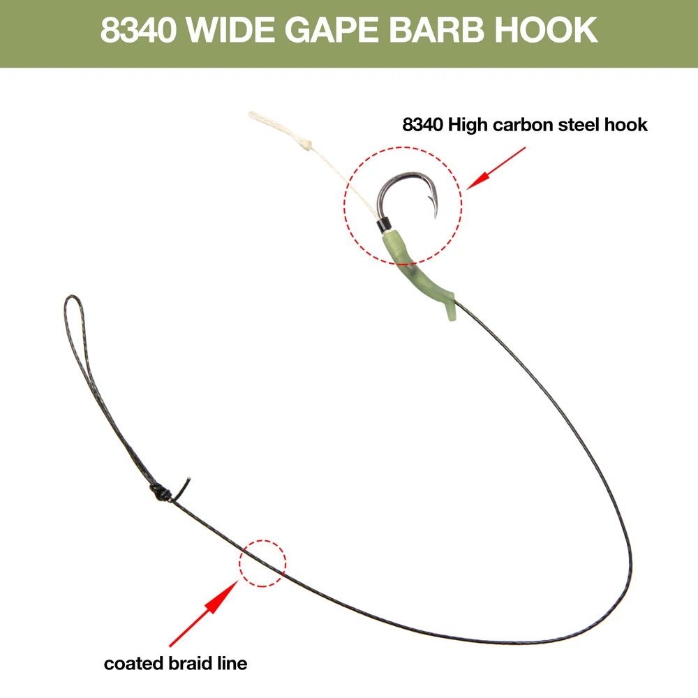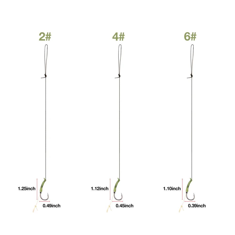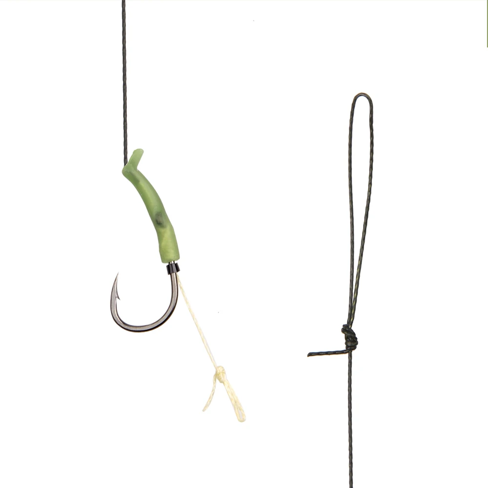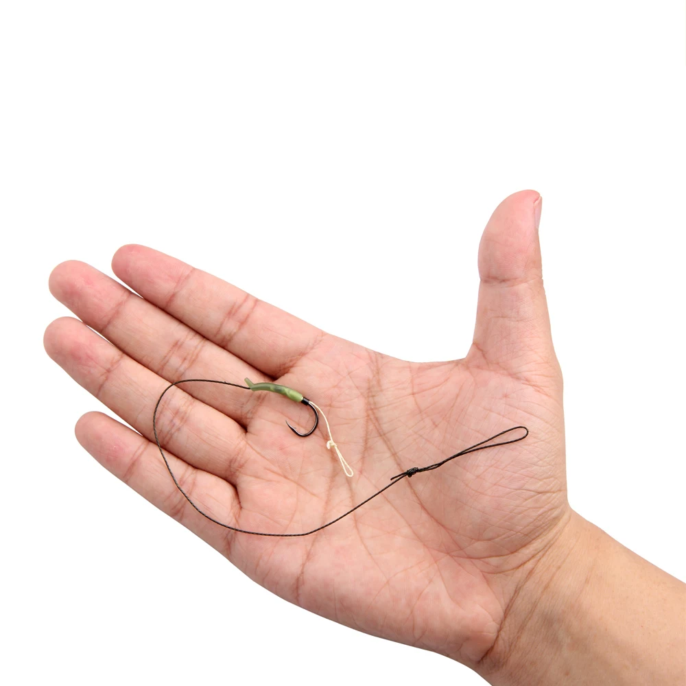 1. Las plataformas de pelo de pesca de carpa incluyen gancho de vástago curvo de acero inoxidable, Mangas de gancho de carpa antienredos y línea recubierta verde