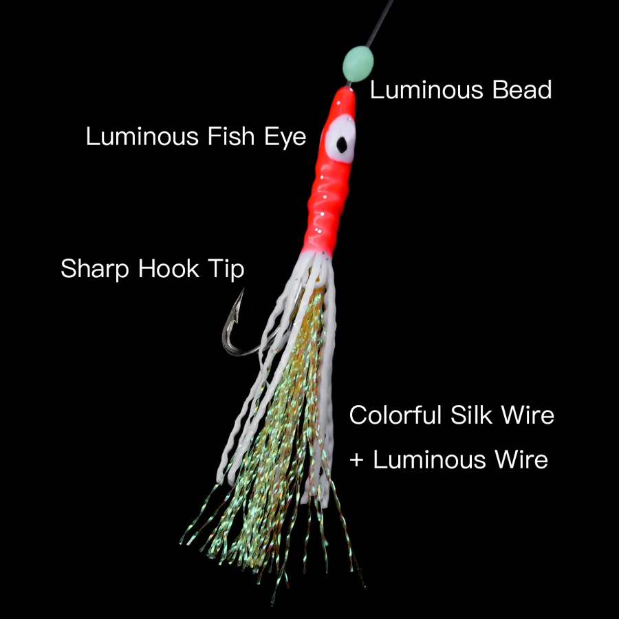 Combo: cuentas brillantes + goma + seda brillante + hilo de pescar + conectores a presión giratorios de enclavamiento con rodamiento de bolas. Luminoso brillante en la oscuridad para atraer peces grandes.
