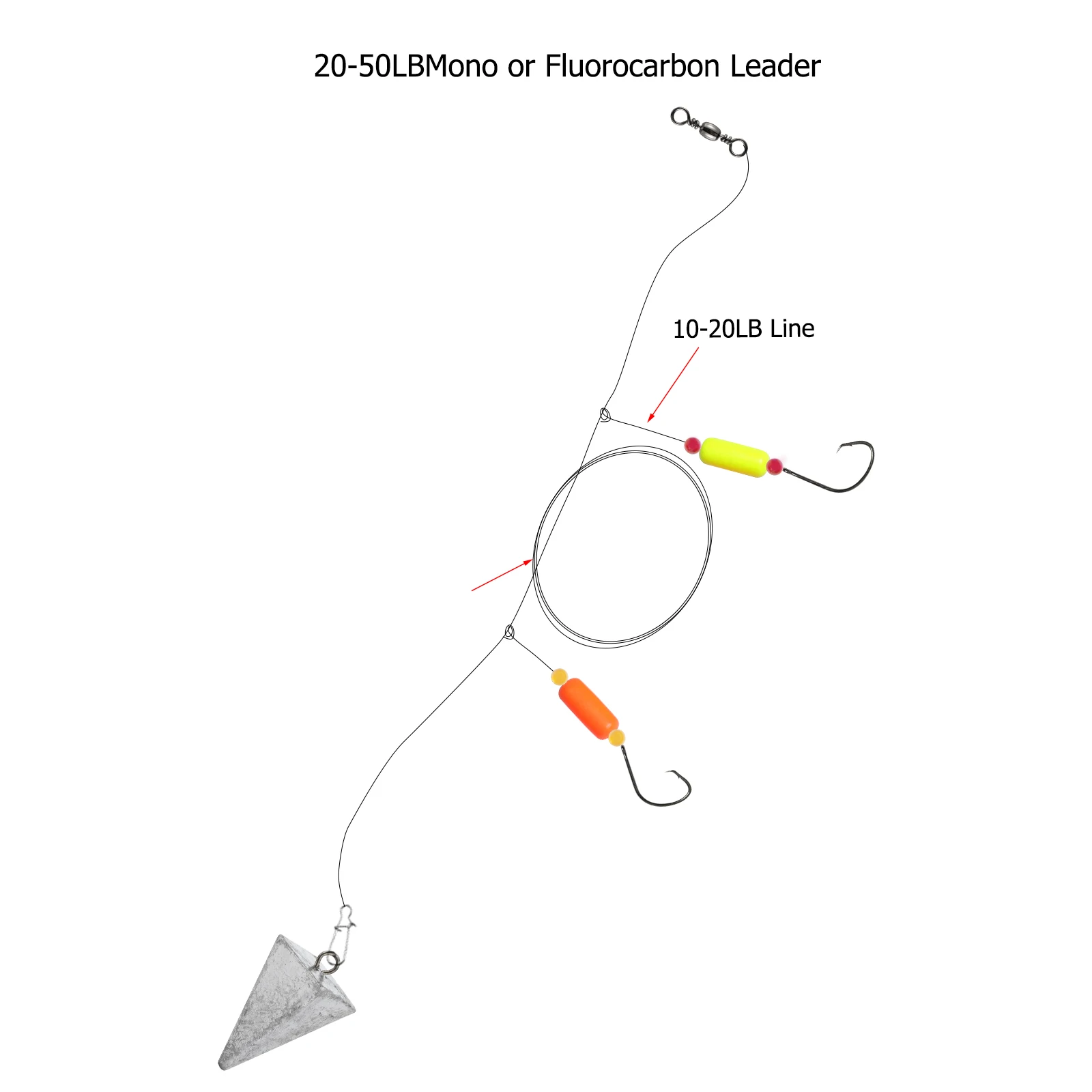 Uso:Corta líneas mono o de fluorocarbono de 30-50 ", 20-50LB como líder, ata un eslabón giratorio y un broche en cada extremo. Luego ATA tus líneas de traza (10-20LB) en tu guía en estilo de bucle cuentagotas, dejando 4-6 "sueltas. Pon abalorios, flotador y gancho. Repita de nuevo en la otra línea de seguimiento dejándola