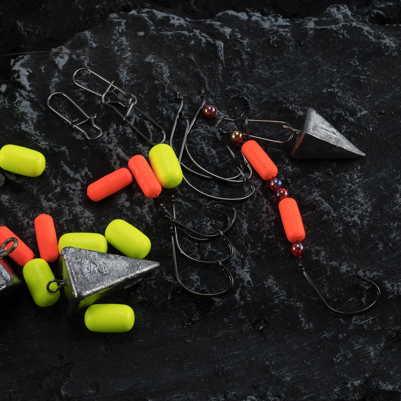 Calidad Premium:El eslabón giratorio está hecho de cobre, acero inoxidable y níquel. La hebilla a presión recubierta está hecha de acero inoxidable, lo que hace que su equipo sea resistente y resistente al óxido, adecuado para el surf y la pesca. Los flotadores y cuentas de colores brillantes especialmente seleccionados harán que su plataforma sea más atractiva. El afilado gancho circular de acero con alto contenido de carbono enganchará al pez más fácilmente.