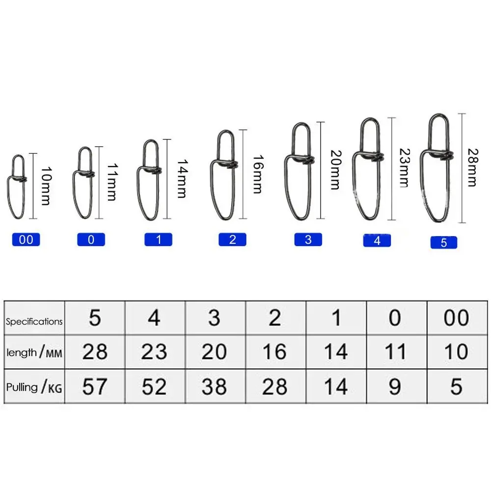 100% nuevo y de alta calidad. Diseño sencillo para un funcionamiento sencillo. Material: acero inoxidable Cantidad: 100 piezas Tamaño: 00 #/0 #/1 #/2 #/3 #/4 #/5 # El paquete incluye: Broche colgante de pesca de 100 piezas.