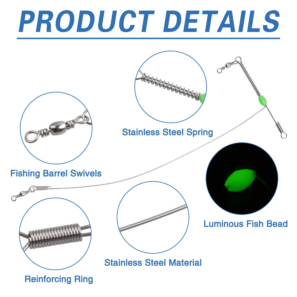 2. Cada Cable de pesca está equipado con una gran cuenta de pesca luminosa, añade atracción durante la pesca nocturna o la pesca en aguas profundas.