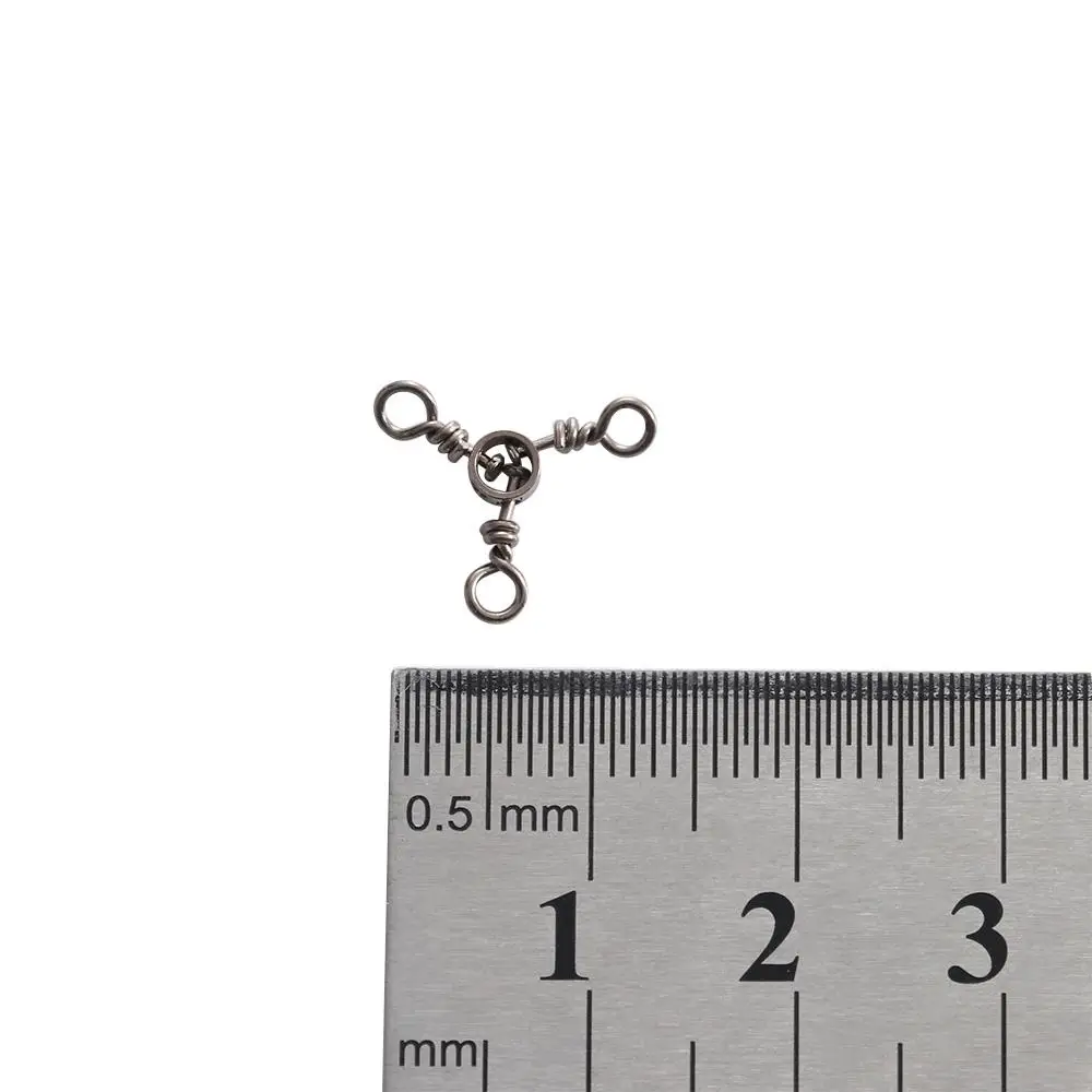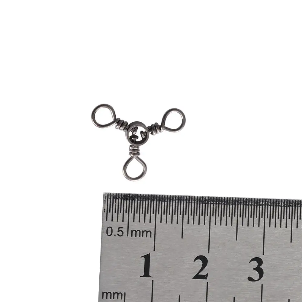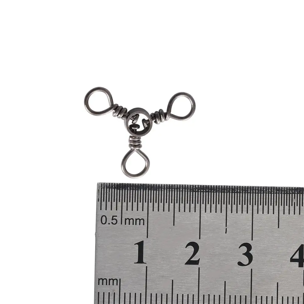 Type:Three-way Swivel Swivel Material: Solid Brass Color: Black Quantity: 25pcs/Pack Pacakge include:25Pcs Three-way Swivel Sizes: Size Height(mm) Pull(kg) 2# 25mm 32kg/71lbs 4# 20mm 19kg/42lbs 6# 15mm 14kg/31lbs 8# 13mm 12kg/27lbs 10# 10mm 7kg/15.5lbs Swivels are constructed with a collar and 3 twisted wire eyes. These swivels are great for bottom rigs, kite fishing, or anywhere a three-way rig is required to connect leaders, main lines and other baits, lures and rigs.