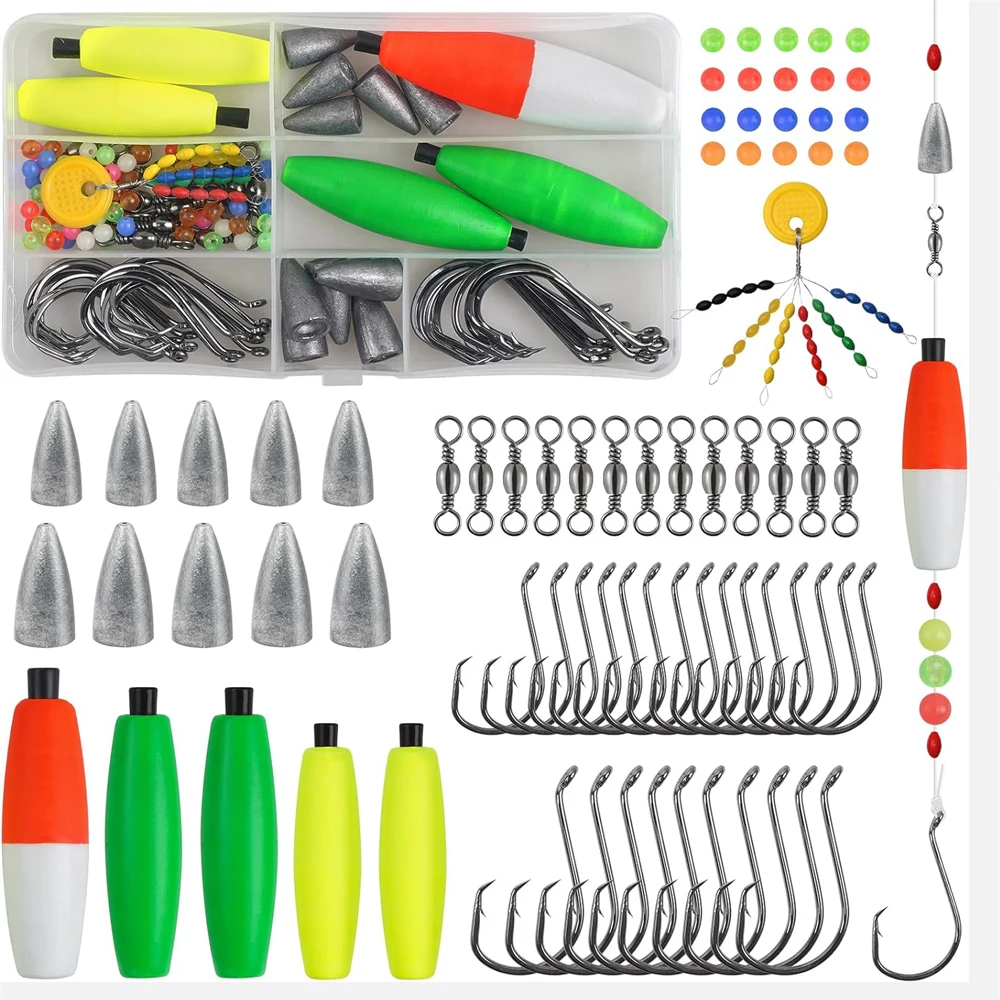 1. El Kit Básico de aparejos de bagre de 86 piezas incluye 5 flotadores de clavijas de 25 anzuelos circulares de bagre, 25 anzuelos de círculo de 25 de caña de pesas, 10 pesos de plomada de bala de 10 de caña de pescar de 10 de caña y 1 Juego de topes de bobber.