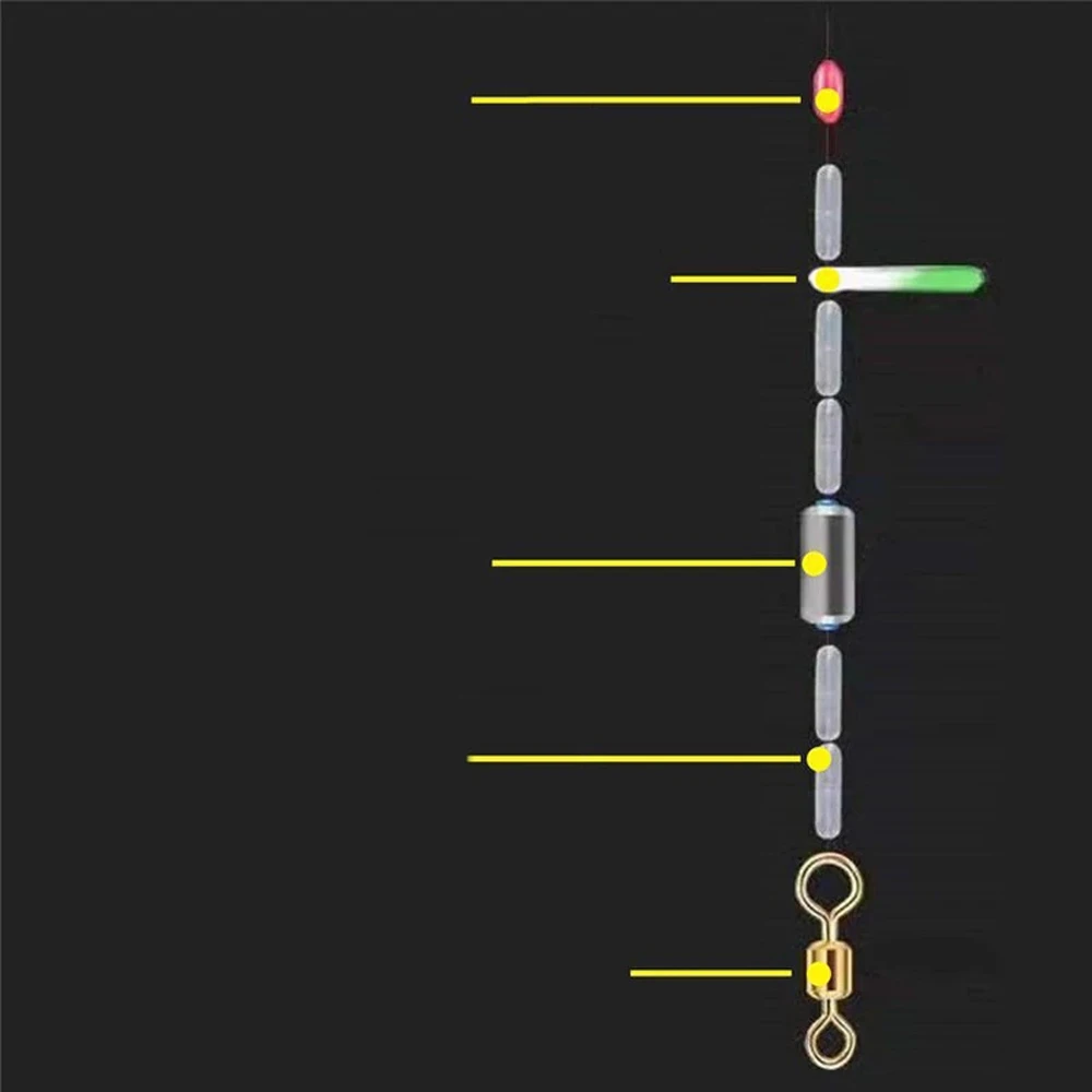 Tamaño: 1,1*4,8mm, 1,2*5,2mm, 1,4*5,8mm, 1,6*6,2mm, 1,8*6,5mm,2.* 7mm Material: flotador de plástico Color: cada grupo de 7 transparente, Cantidad 1 rojo: 10 juegos/80 piezas Paquete incluido: 10 juegos X flotador de pesca