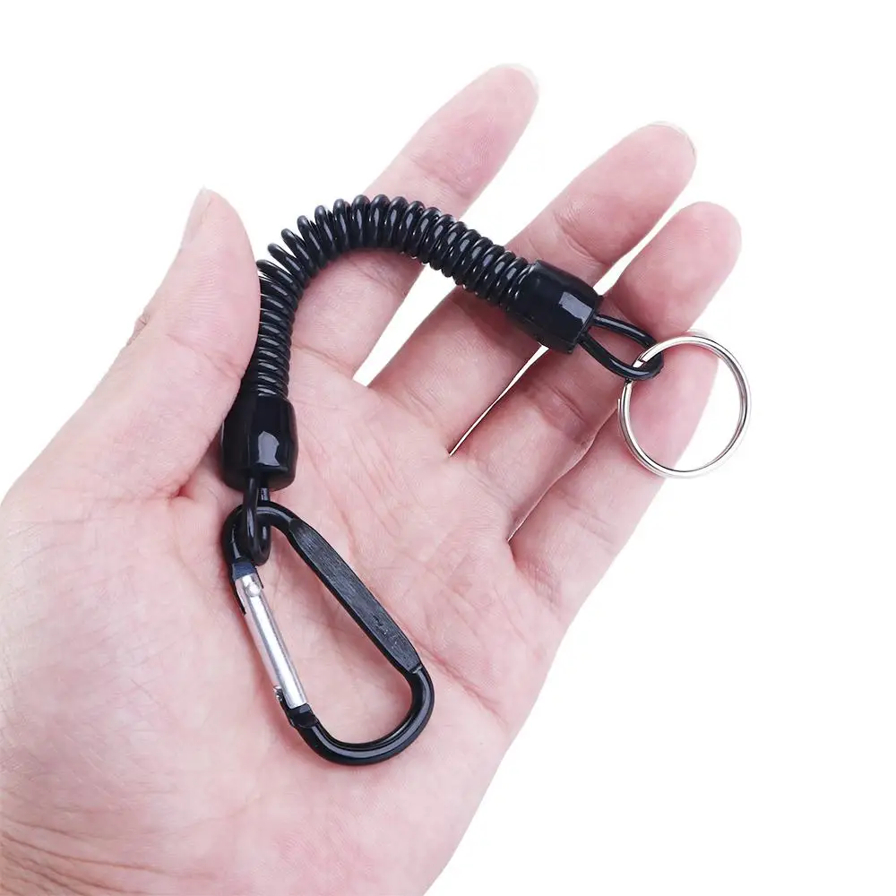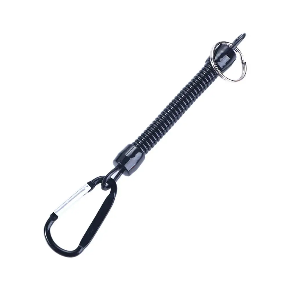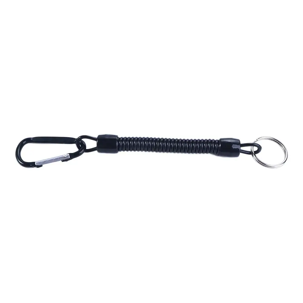 Material: TPU Wire diameter: 2.5mm Roll diameter:10mm Total length:12CM Carabiner color:Random Package includes:1pc spring rope with keyring and carabiner Features: Made of quality material,practical and durable Lightweight and easy to carry Ideal for securing pliers, lip grips, tool rods, and reels for camping, fishing and general use Aluminium carabiner on one end and iron ring on the other end can attach your gear to your belt or boat or kayak