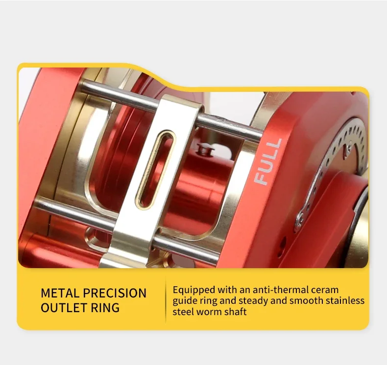 Equipado con un anillo guía de cerámica antitérmica y un eje de gusano de acero inoxidable estable y suave. Mantiene el hilo de pescar siempre en perfectas condiciones, especialmente cuando se sale el hilo de alta velocidad.La perilla de reinicio ayuda a que el hilo de pescar y la línea de viento nivelada mantenga la sincronización por completo y ayuda a proteger el hilo de pescar y los engranajes contra daños.