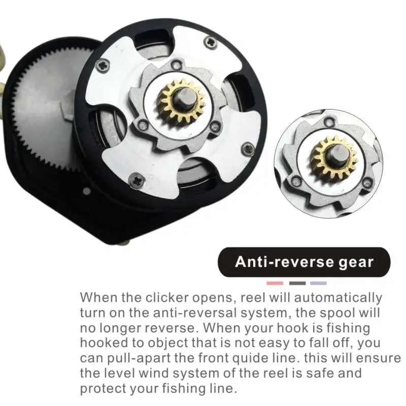 Cuando se abre el clicker, el carrete activará automáticamente el sistema anti-reversa y el carrete ya no retrocederá.Cuando su anzuelo está enganchado en un objeto que no se cae fácilmente, puede arrancar la línea delantera.Esto asegurará que el sistema de viento nivelado del carrete sea seguro y protegerá su hilo de pescar.