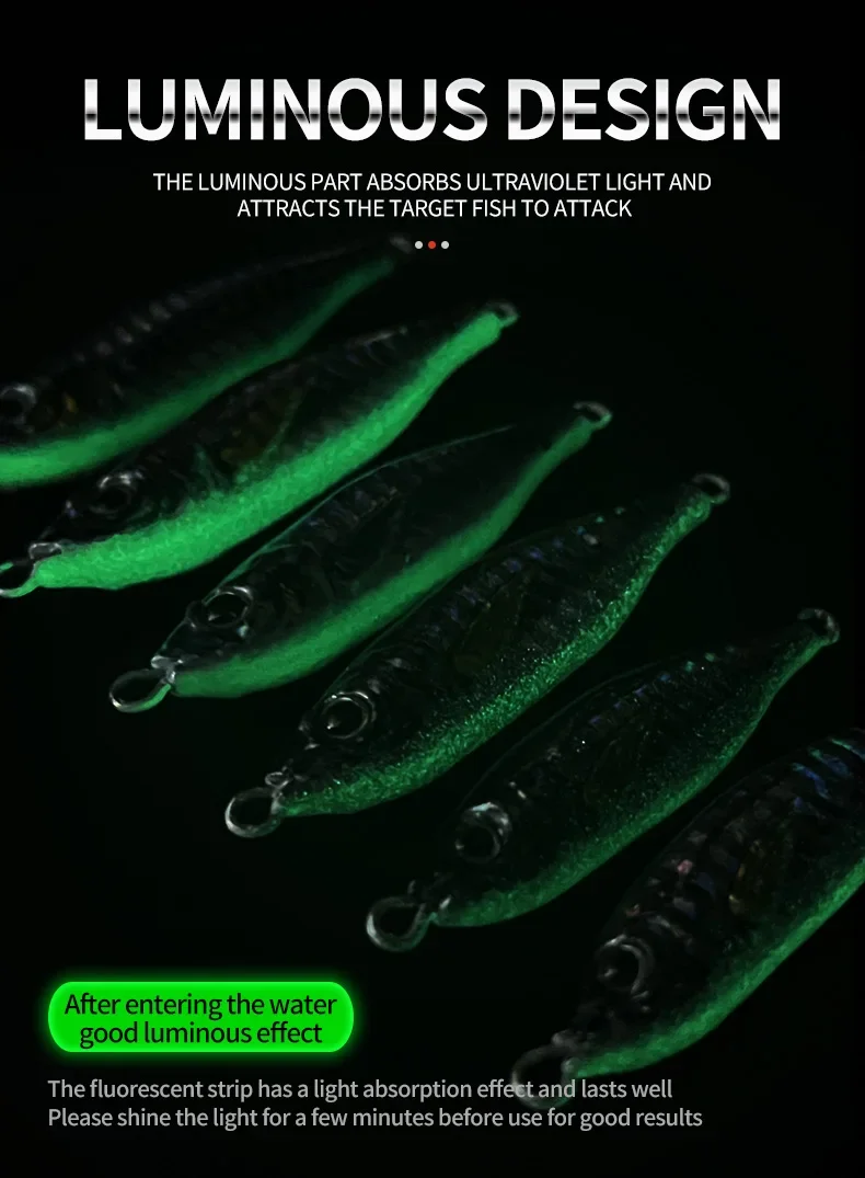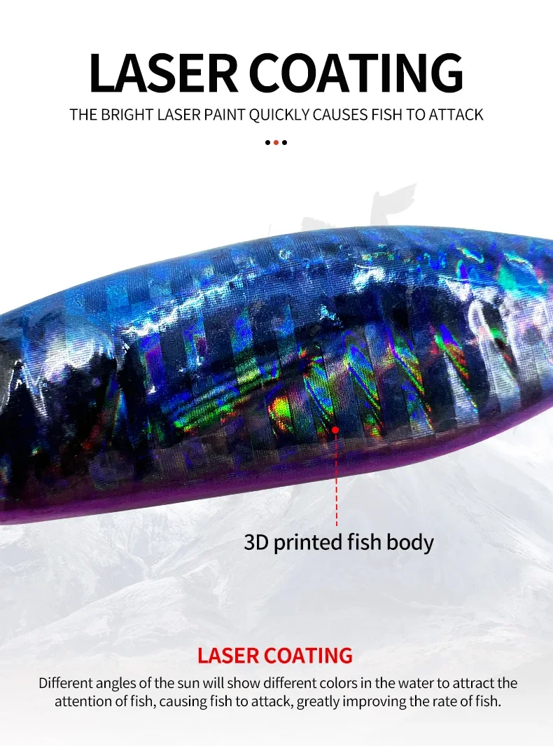 【Efecto de recubrimiento láser】:Las plantillas de pesca cubiertas con el proceso de recubrimiento de pintura multicapa evitarán al máximo la descamación. Puede reflejar el UV en todos los ángulos y producir destellos brillantes, que pueden estimular eficazmente a los peces a la presa. Muy adecuado para su uso en aguas oscuras y en condiciones de poca luz.