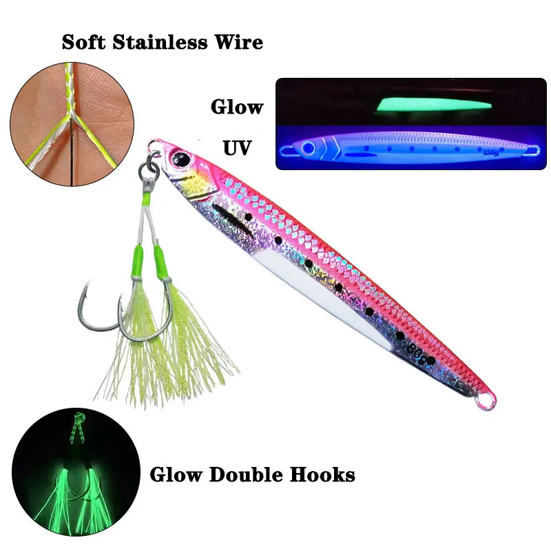 AS 10 pares de anzuelos de pesca de alambre inoxidable suave, anzuelos de Jigging lento/rápido, anzuelos de asistencia de doble púas, anzuelos de señuelo que brillan