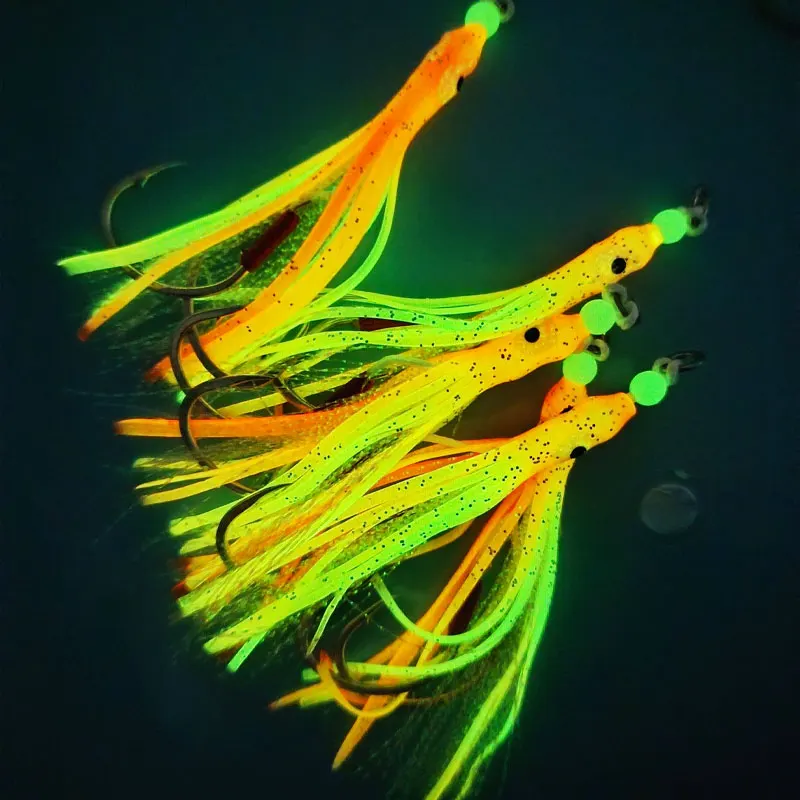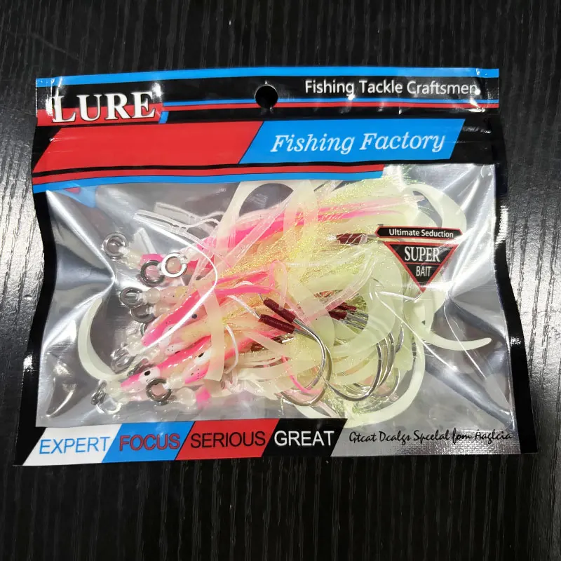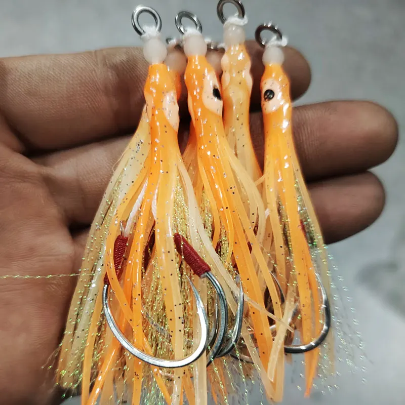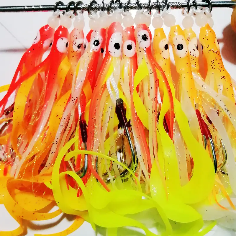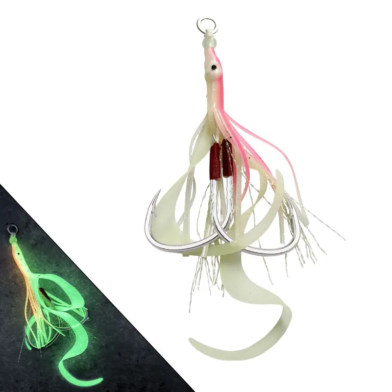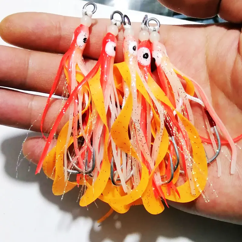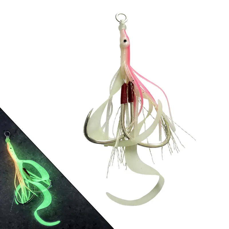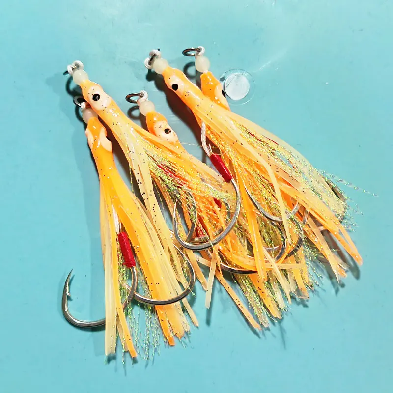 AS 10 pares de anzuelos de púas, anzuelos dobles, faldas de calamar suaves con forma de pulpo brillante, anzuelos de Pesca, plantilla de cebo de Metal, aparejos de anzuelo de asistencia para Pesca