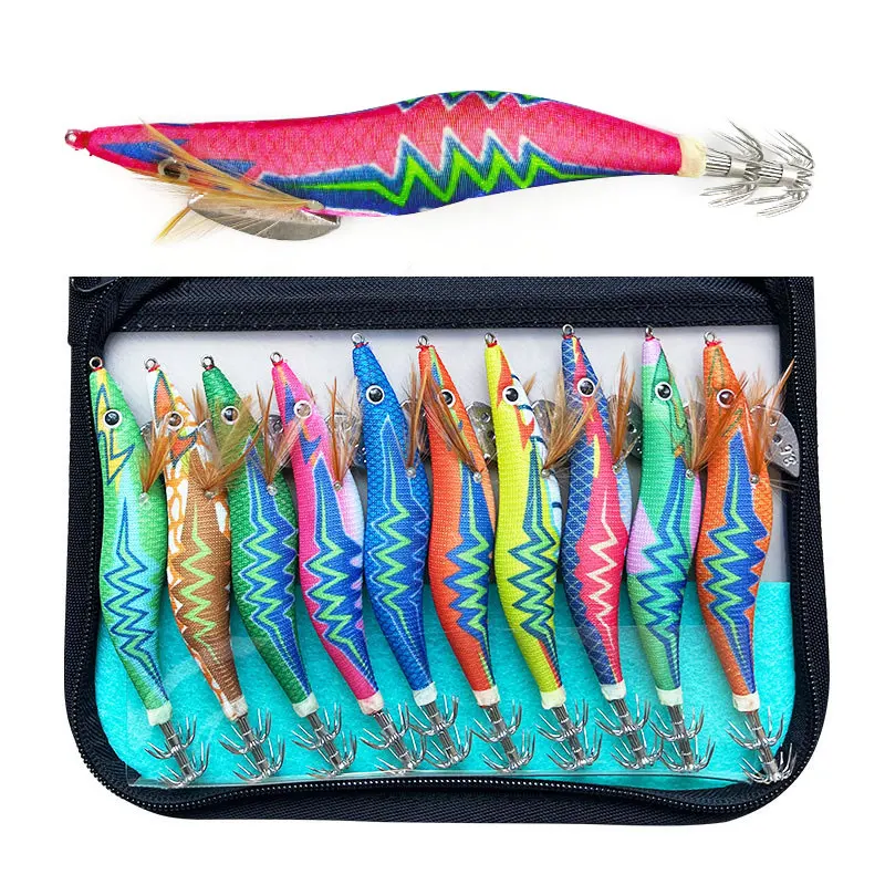 AS-anzuelo de calamar de 10 piezas, coronas de camarones de madera, cebo duro brillante 2,5 #3,0 #3,5 #, juego de Señuelos de Pesca de Mar, sepia Artificial, pulpo