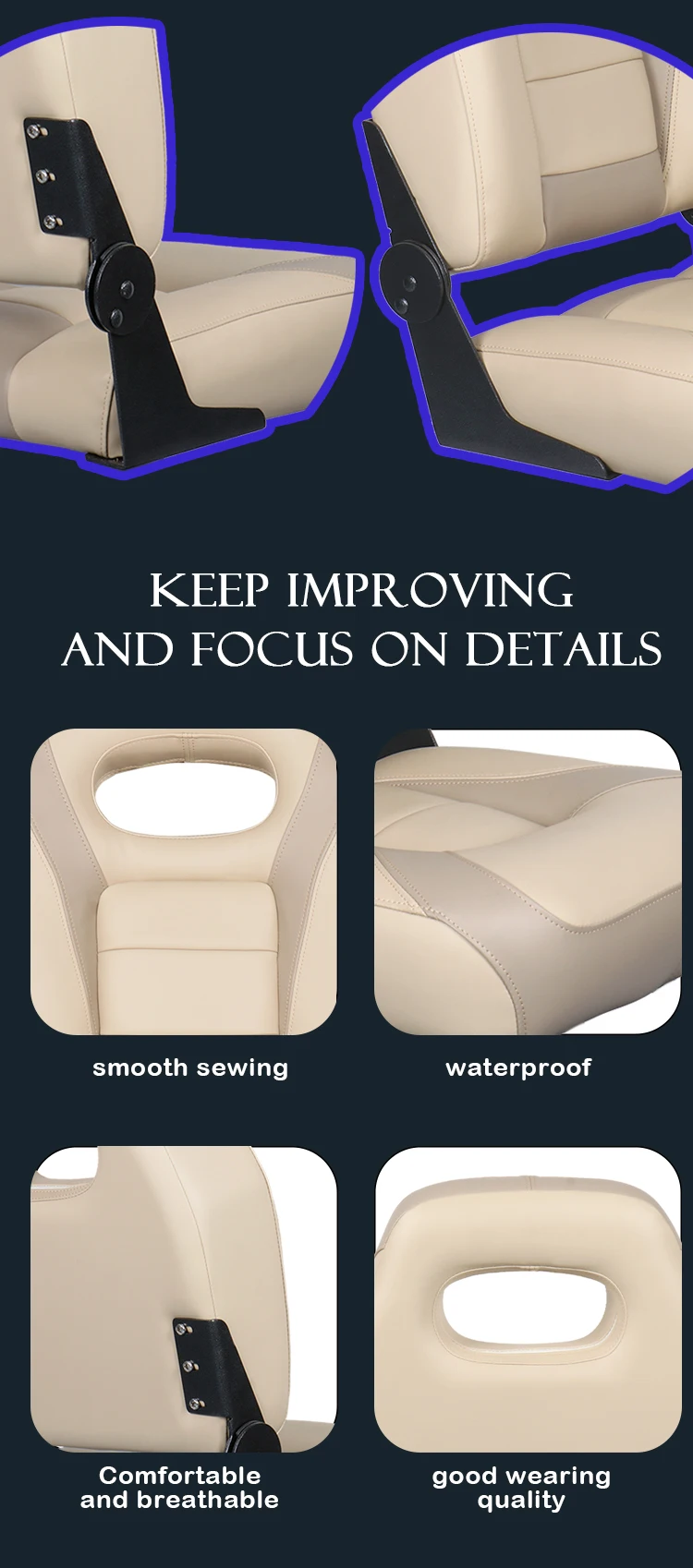 -Excelente durabilidad y estabilidad: además de facilitar el plegado, las bisagras de aleación de aluminio resistente a la oxidación también pueden evitar que el respaldo se doble, por lo que es capaz de soportar el impacto de grandes olas. Además, el cuero de PVC impermeable y resistente al desgaste también extiende la vida útil.