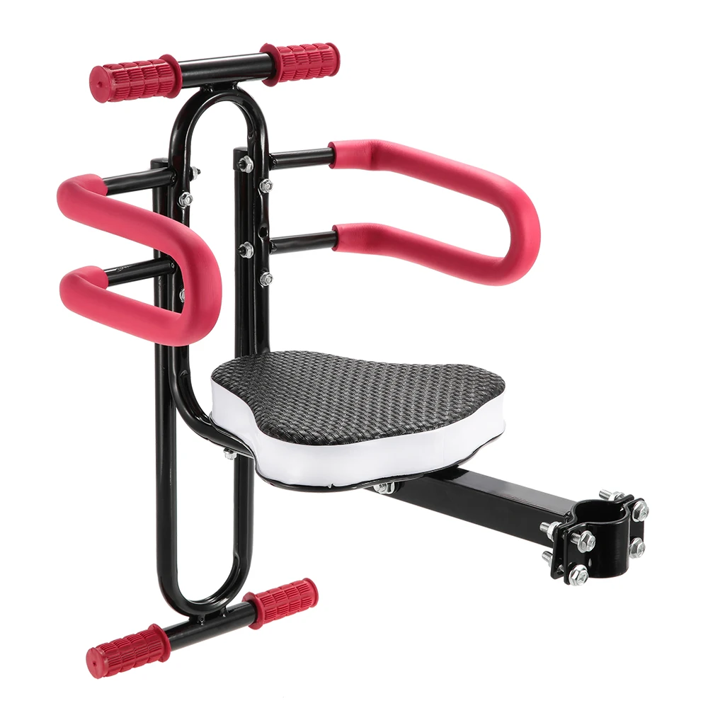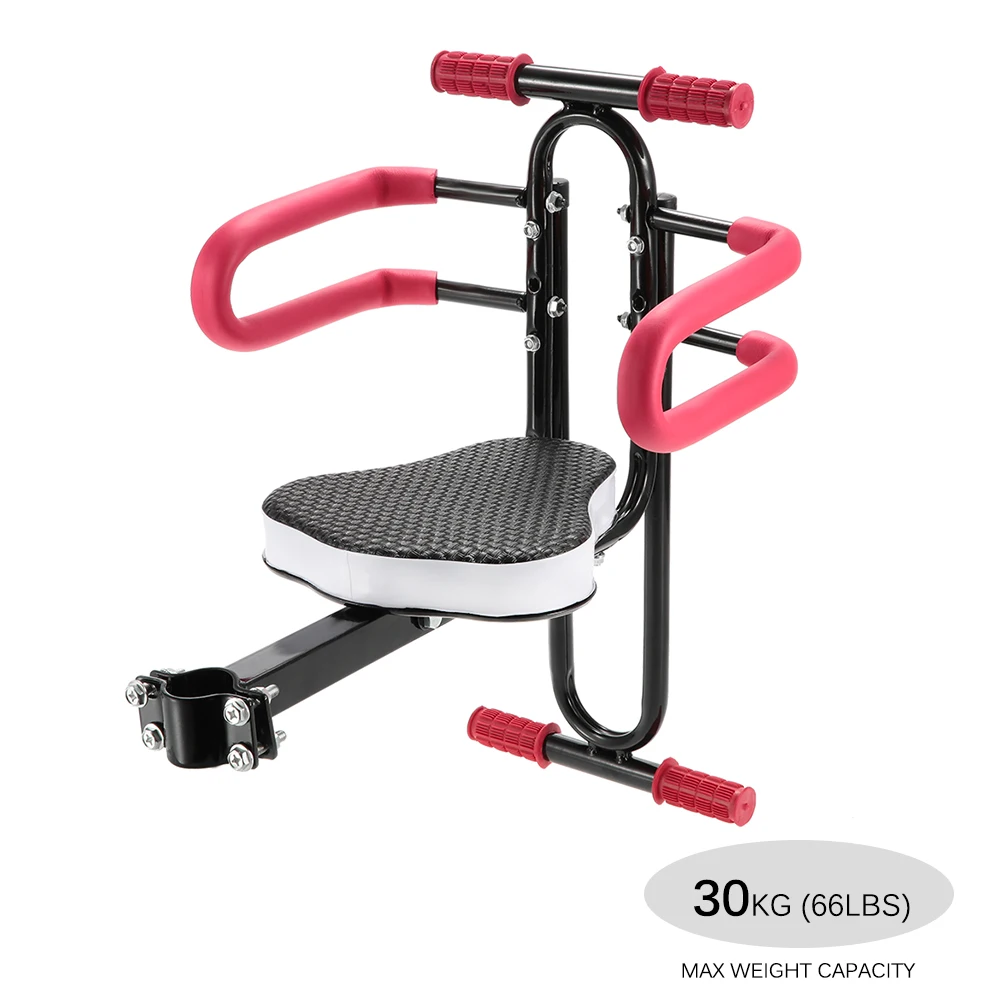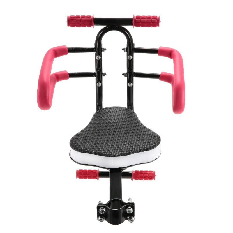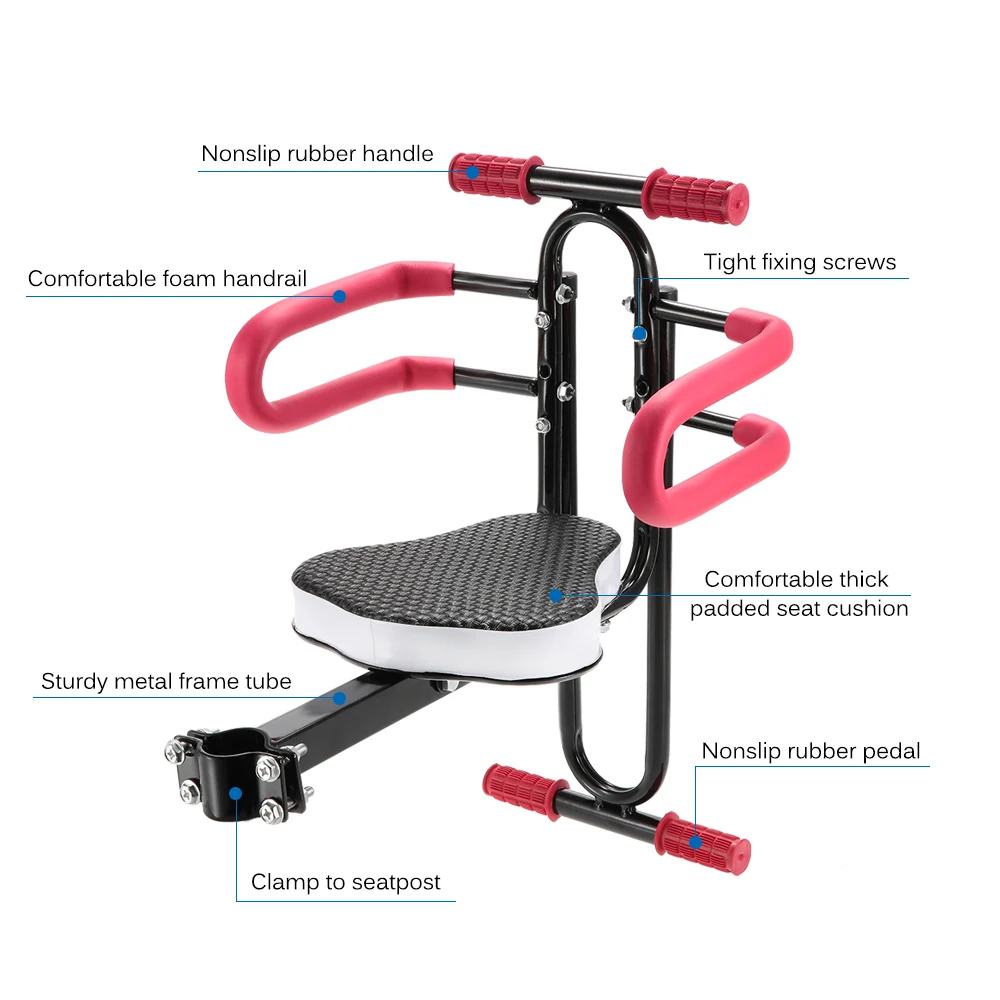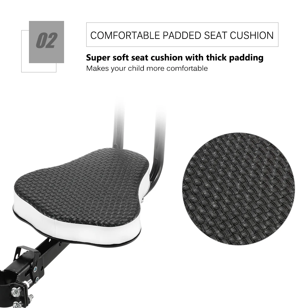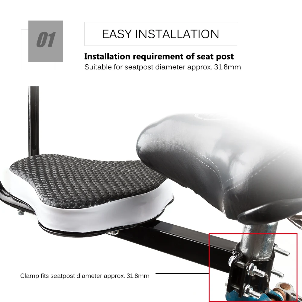 Este asiento delantero de bicicleta le permite vigilar a su hijo y la carretera al mismo tiempo. El cojín grueso proporciona comodidad, los pasamanos antideslizantes aumentan la seguridad, el tubo resistente soporta una capacidad de 30kg. Es fácil de instalar y desinstalar, adecuado para tijas de sillín de 31,8mm.