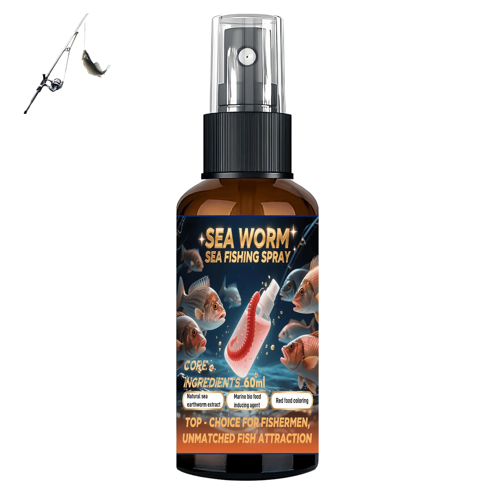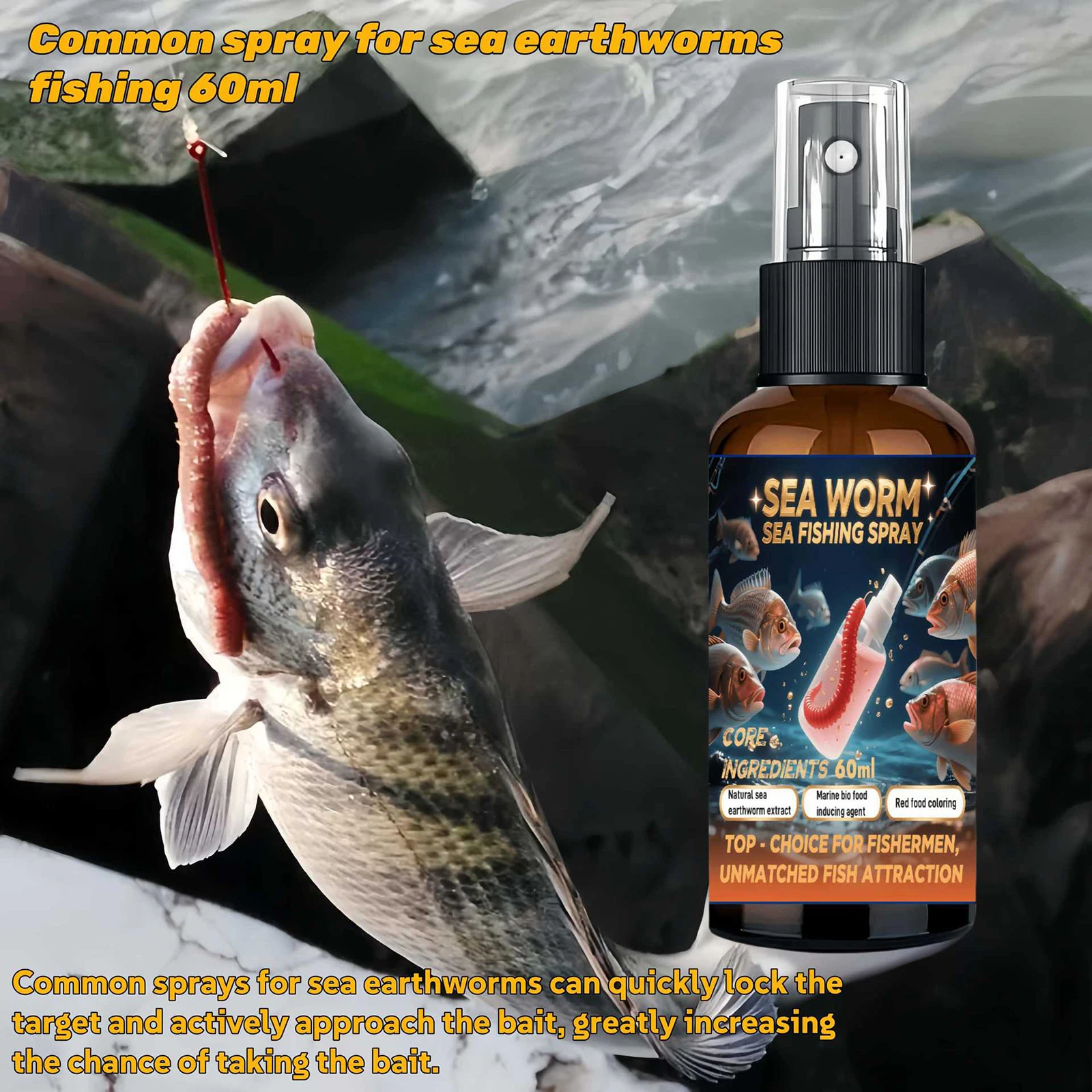 Spray de pesca multiusos: perfecto para todos los entusiastas de la pesca, este spray funciona como un poderoso atrayente para diversas especies de peces, mejorando el aroma del cebo y mejorando las tasas de éxito tanto en agua dulce como salada.