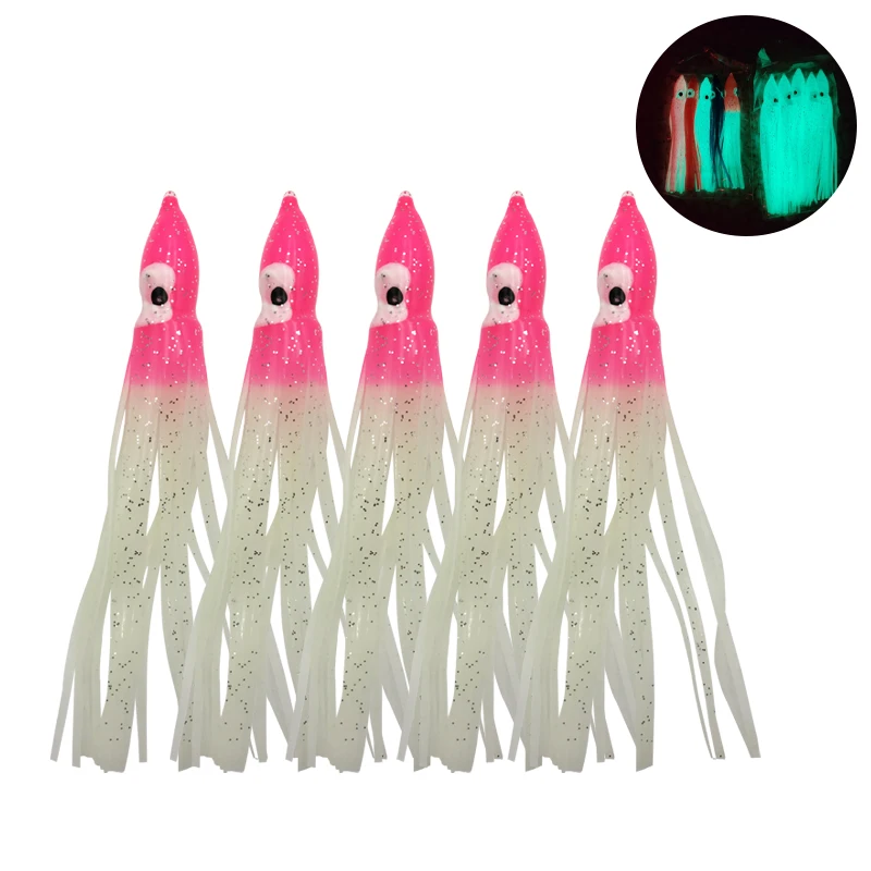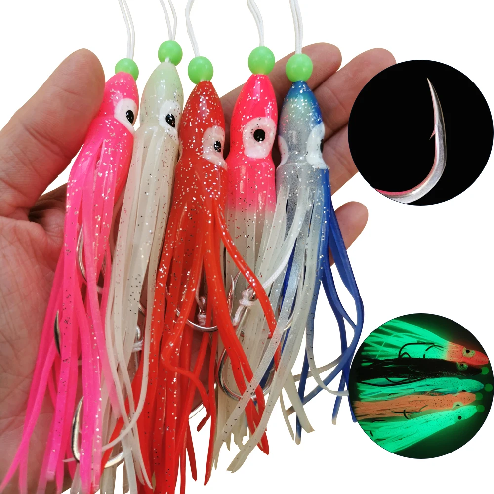 Atsuim-anzuelos de calamar para pesca, 10 piezas, faldas de pulpo, señuelos suaves de goma luminosa de 12cm, cebos artificiales de pez vela, colores mezclados