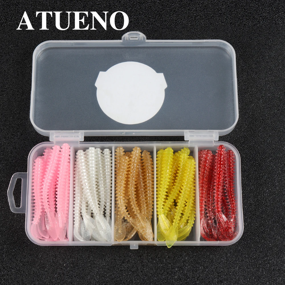 ATUENO Juego de Señuelos de Pesca, 50 Uds., Mini Gusano Suave, Jerkbait, Señuelo de Roca del Océano, Plantilla de Lubina, Kit de Cebo Suave