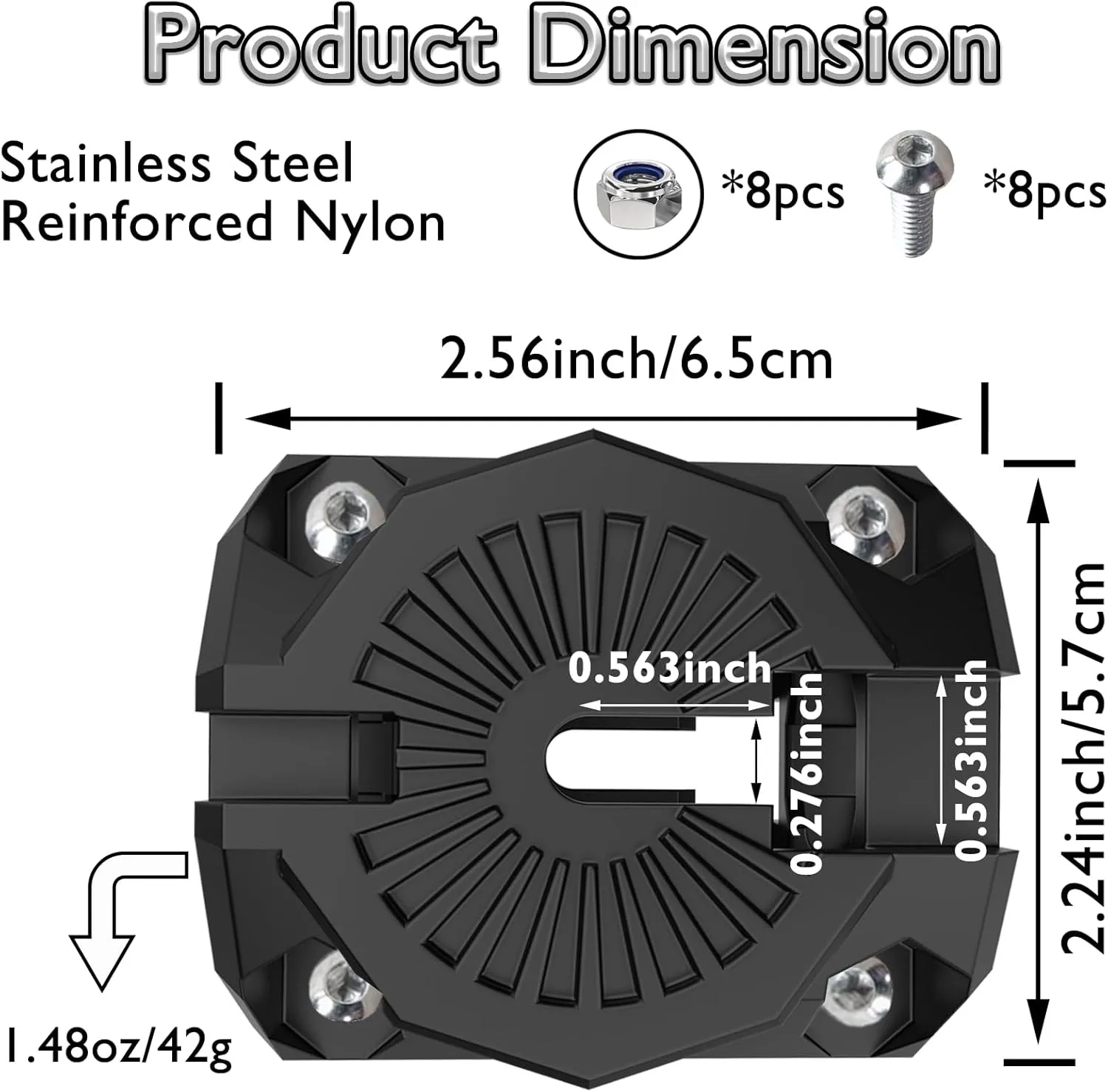 Cada conjunto de productos pesa alrededor de 4 onzas; el tamaño del producto es 2,25 de largo * 2,28 de ancho * 2,12 pulgadas de alto: contiene los tornillos, tuercas y herramientas necesarios, vendidos como un paquete de dos unidades.