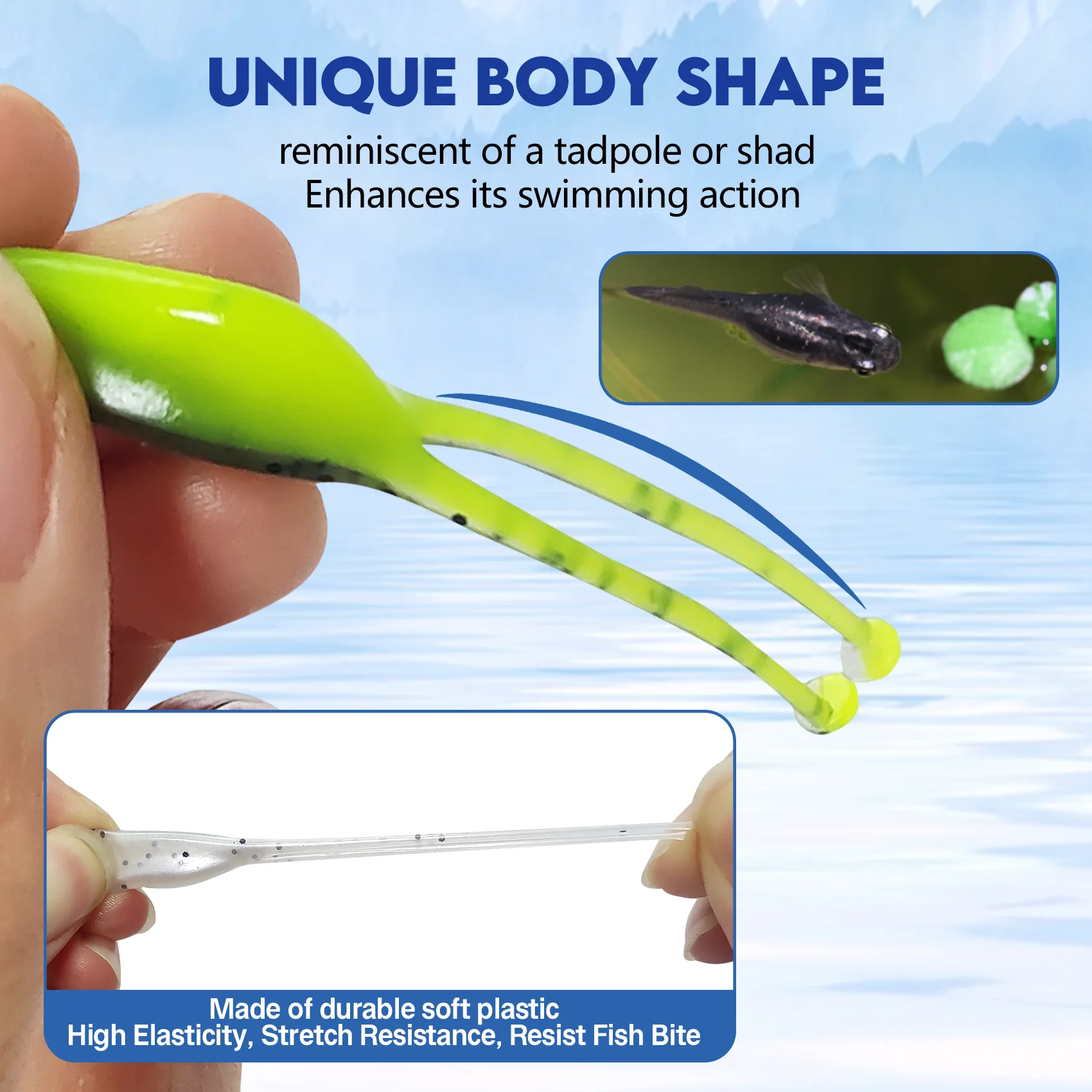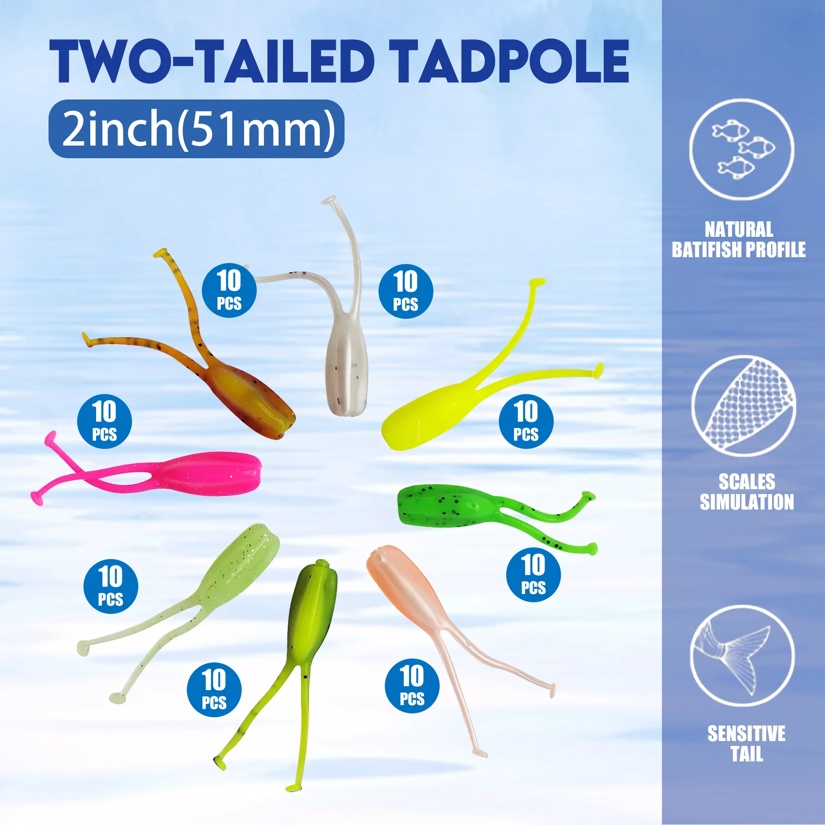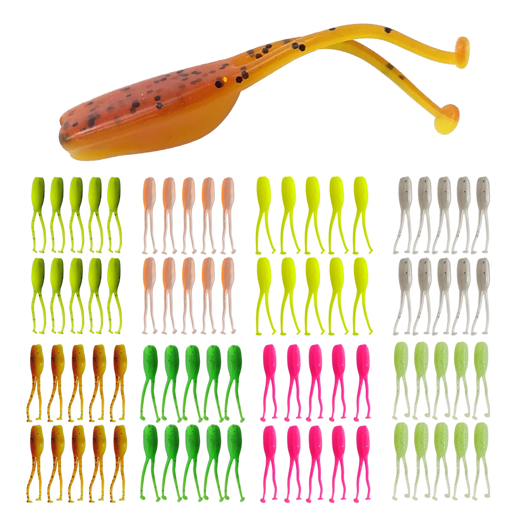 Tadpole de dos colas: 2 pulgadas de largo, 80 unidades en 8 colores.La sección de cola hiperactiva que se activa con el más mínimo movimiento.Su tamaño y perfil están diseñados específicamente para atraer y desencadenar tipo de pez, perca y otros panfish.Una recuperación lenta, una acción de onda o corriente crearán una vibración de cola de alta energía y una acción de natación en este cebo.