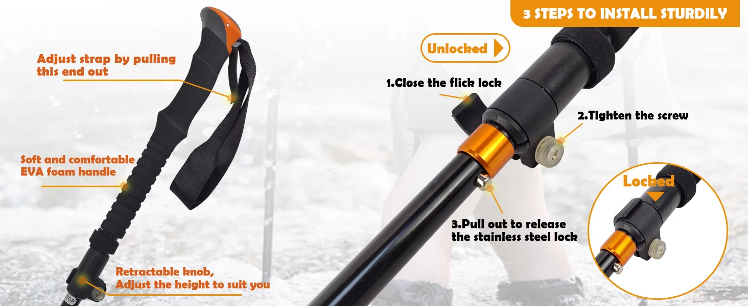 Cada Sección del bastón retráctil se estira y fija fácilmente. Simplemente tire del interruptor para fijarlo en su lugar, lo que lo hace fácil de usar incluso para principiantes. Rápido y fácil de ajustar a mano, lo que lo hace adecuado para adultos de diferentes alturas.
