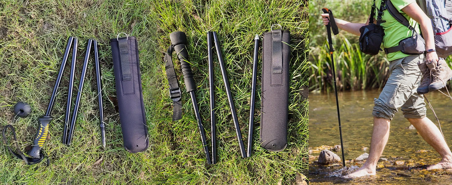 El paquete incluye un bastón de trekking retráctil y plegable con funda de neopreno. Hecho de aluminio ultraligero 7075 de alta calidad, que es anticorrosión, firme y duradero. Cuenta con mango EVA de primera calidad y un cordón de metal elástico recubierto en el interior, lo que garantiza que pueda soportar las demandas del uso constante al aire libre.