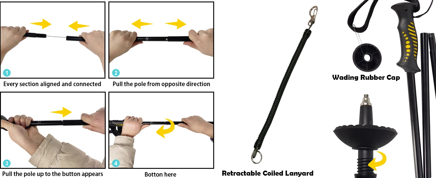 Estos bastones de vadeo garantizan una base segura mientras vadeas varias profundidades de agua, ofreciendo soporte y equilibrio para evitar posibles resbalones y caídas. Ideal para vadear en el agua, escalar orillas de ríos