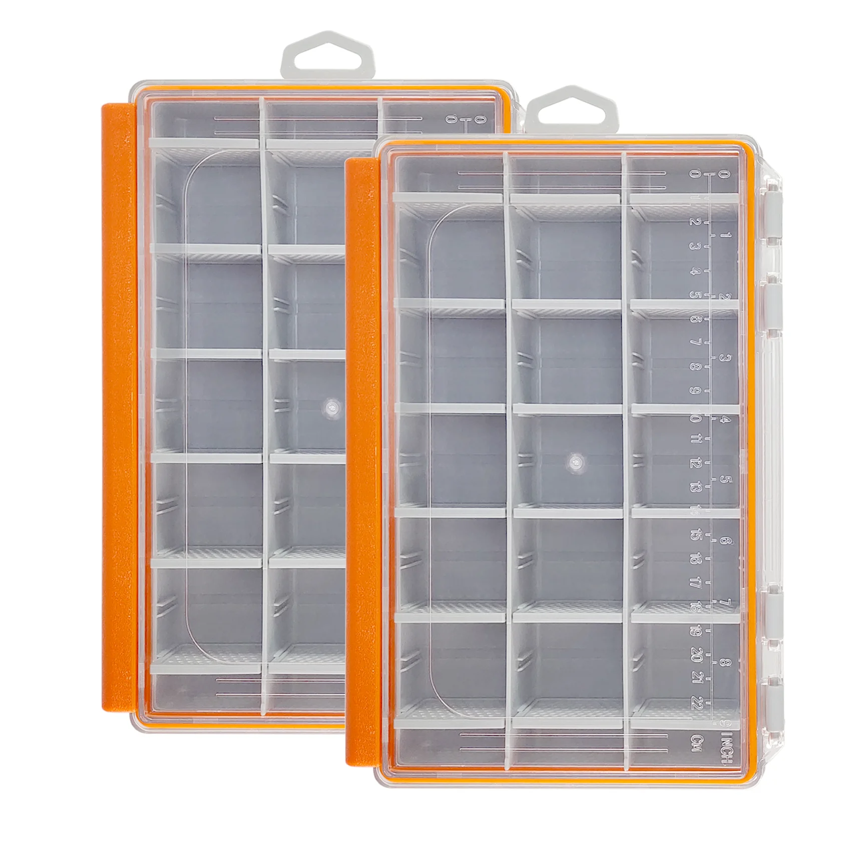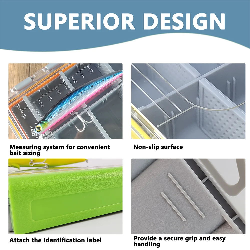 La caja de aparejos viene con una tapa altamente transparente, que proporciona una visión clara de sus cebos, mientras que el anillo de tracción garantiza una fácil portabilidad.La tapa incluye un sistema de medición para dimensionar cómodamente el cebo y el cuerpo etiquetado permite una rápida identificación al organizar sus aparejos de pesca.Esta caja es una excelente opción para los pescadores.