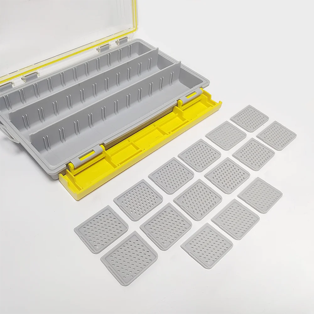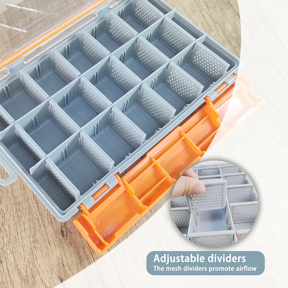 La caja de almacenamiento cuenta con divisores ajustables que ofrecen flexibilidad para organizar cebos de plástico, aparejos terminales, tuercas, tornillos, cuentas, alambres, carretes de hilo y otros artículos pequeños.Los divisores de malla promueven el flujo de aire.