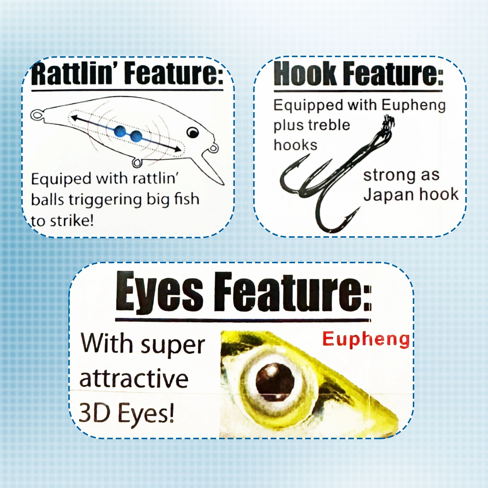 Equipado con anzuelos triples Eupheng Plus afilados y de alta calidad, que garantizan un anzuelo fuerte y seguro para una captura exitosa.
