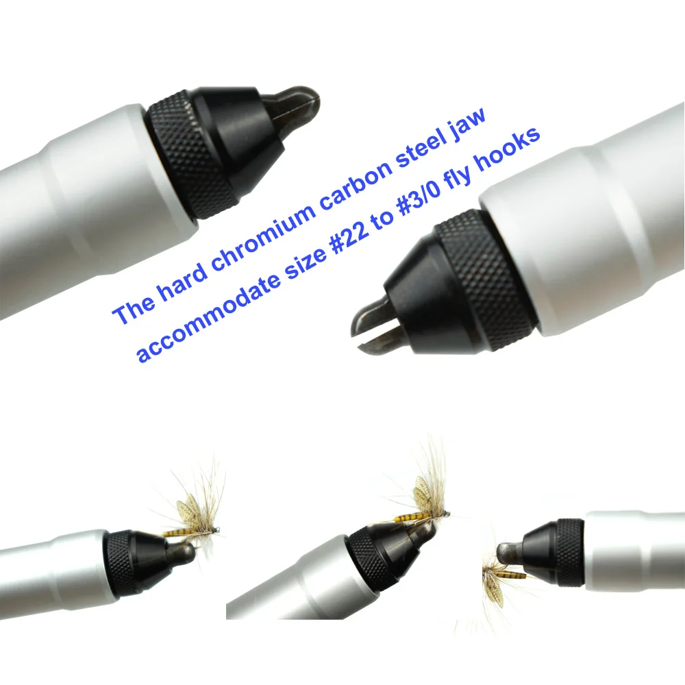 La mandíbula de acero al carbono de cromo duro acomoda ganchos para moscas de tamaño #22 a #3/0. Tenga en cuenta que esto es aproximado, ya que el calibre del cable utilizado para fabricar anzuelos voladores varía de marca a marca. Cancelamos el programa de mandíbula midge adicional después de la primera prueba butch, no es necesario. Dado que esta mandíbula estándar tiene todas las funciones.